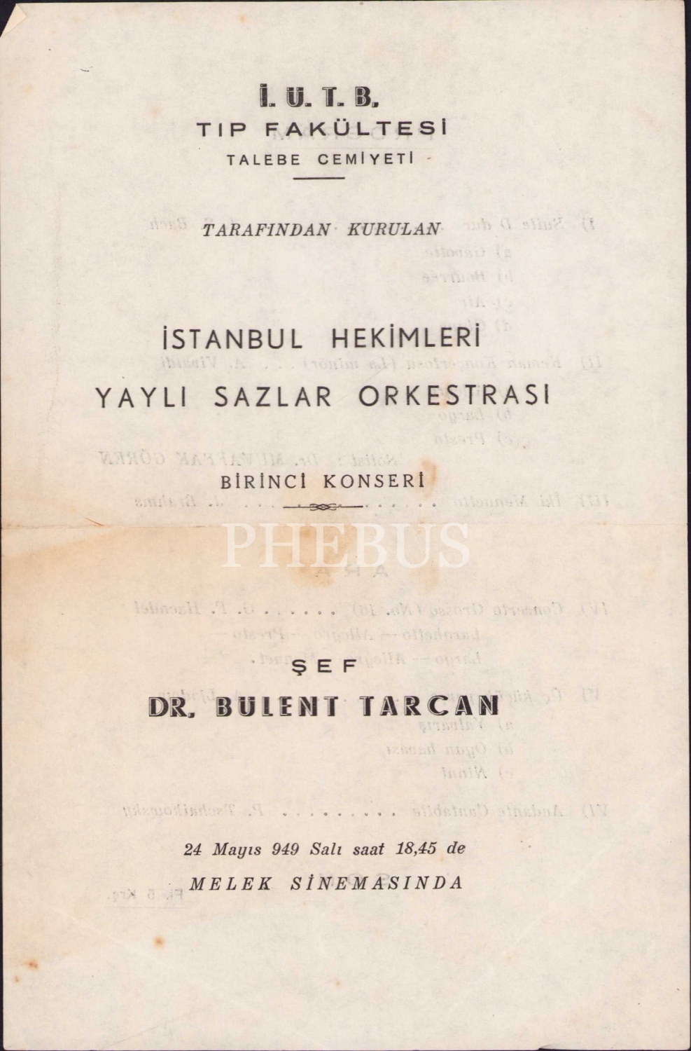İ.Ü.T.B. Tıp Fakültesi Talebe Cemiyeti: İstanbul Hekimleri Yaylı Sazlar Orkestrası - birinci konser programı, şef Dr. Bülent Tarcan, 1949,14x22 cm