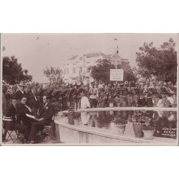 Manisa Hükümet Parkı'nda konser veren askeri bando takımı, 'Çocuklarına Eyi Bakmayan Milletler Mahvolur' yazılı pankart detaylı, arkası yazılı, ithaflı