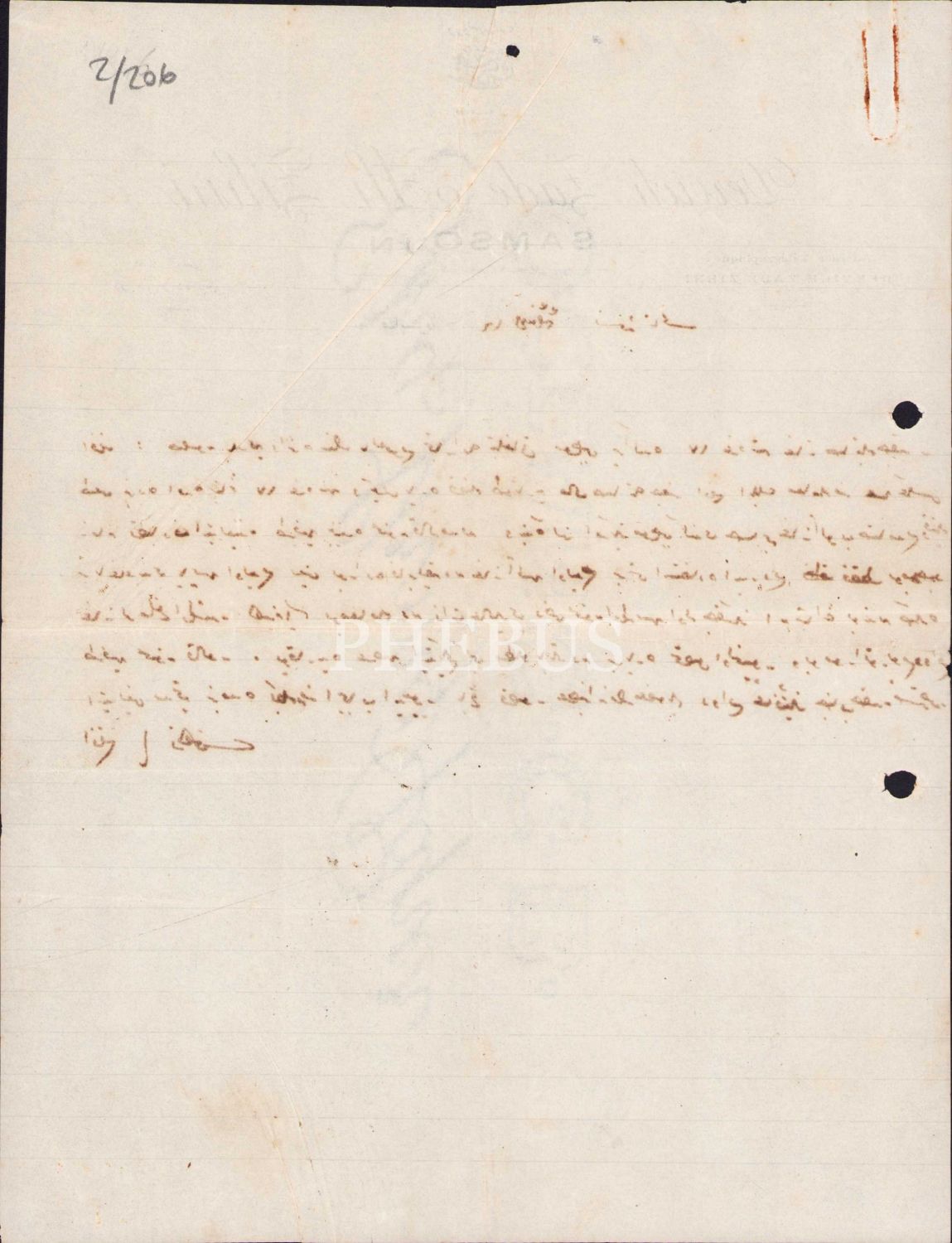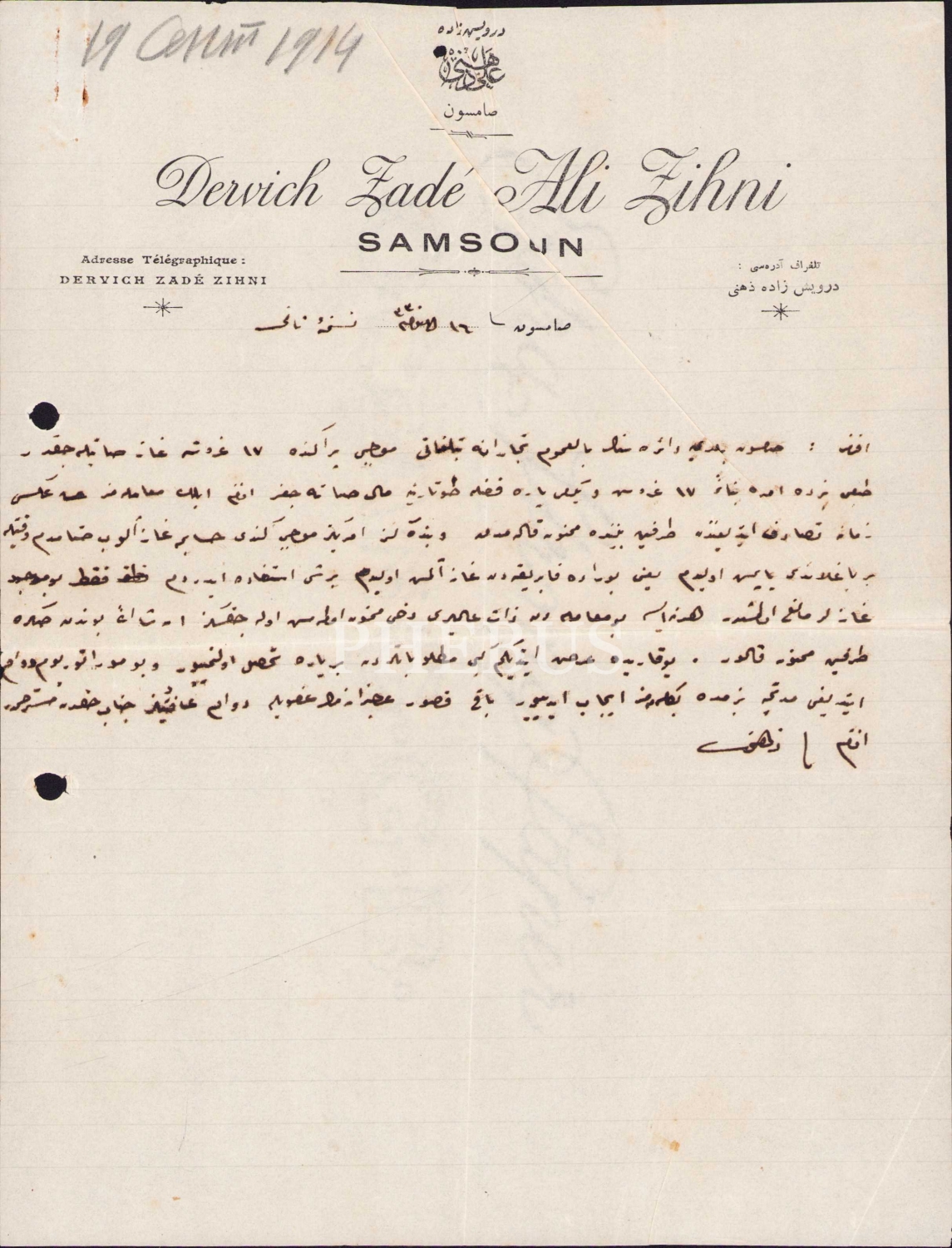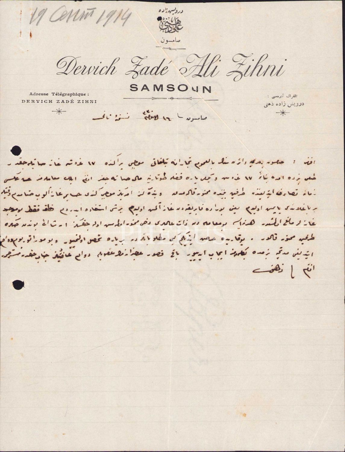 Osmanlıca Fransızca Derviş Zade Ali Zihni Samsun antetli, 1330 tarihli Osmanlıca yazılı doküman, 19x26 cm