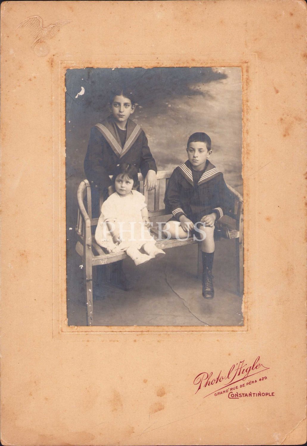Photo L'Aigle Pera, Constantinople, Üniformalı çocuklar kabin fotoğrafı, Osmanlıca ithaflı 1917, 10x14 cm