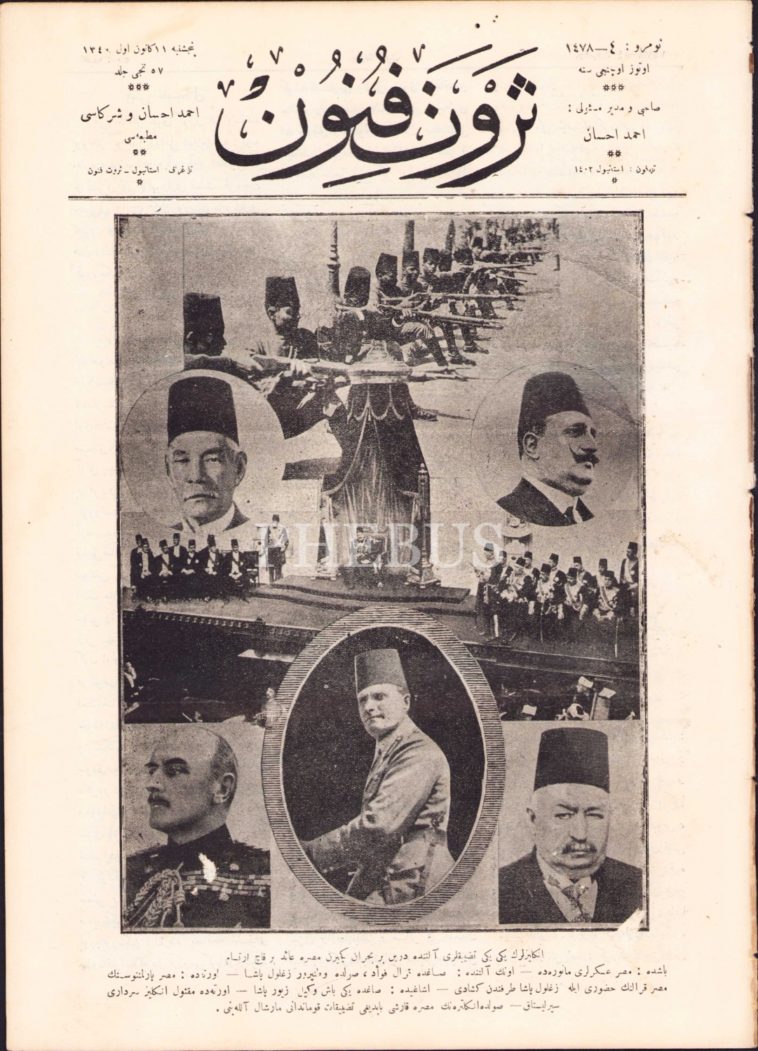 Osmanlıca Servetifünun gazetesi, sahibi Ahmed İhsan, 1340, kapak "İngilizlerin Yeni Yeni Tazyikleri Altında Derin Bir Buhran Geçiren Mısıra Ait Birkaç İrtisam [resim]: Kral Fuad, Mısır Askerleri, Vatanperver Zalul Paşa.."