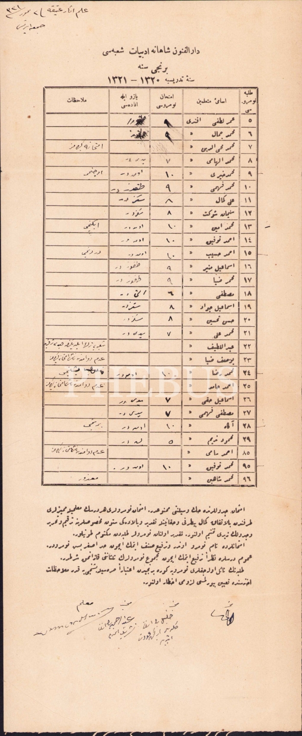Osmanlı Darülfünun-ı Şahane Edebiyat şubesi birinci sene 1321 - 1320 ders dönemi öğrenci listesi, 16x40 cm