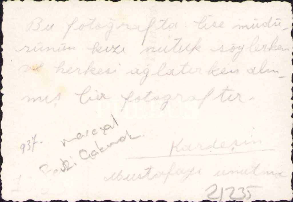 Mareşal Fevzi Çakmak'ın karşısında, kız talebe nutuk söylerken, 1937 tarihli, 8x6 cm