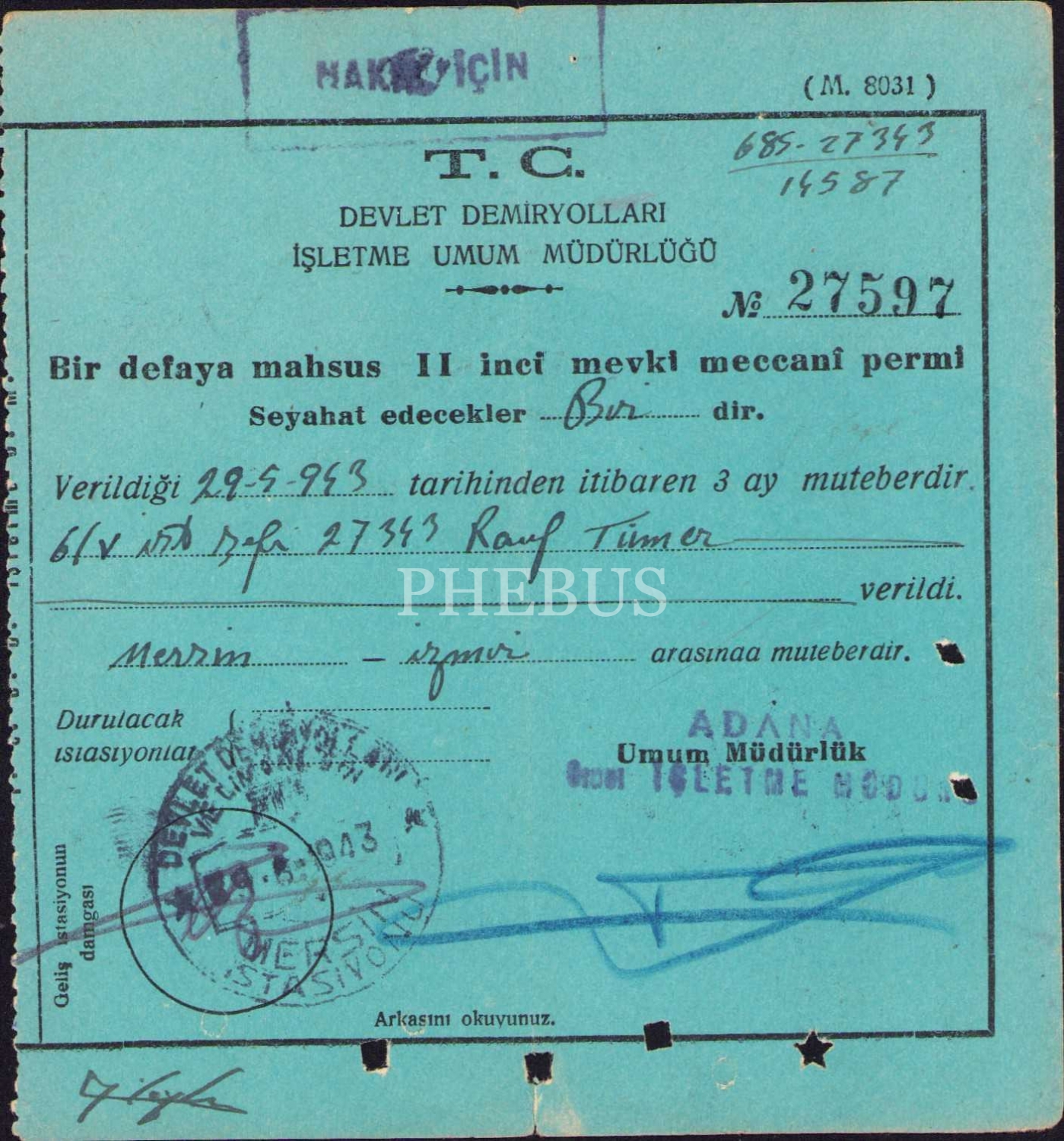T.C. Devlet Demiryolları İşletme Umum Müdürlüğü geçici seyahat kartı, 1942, 12x13 cm