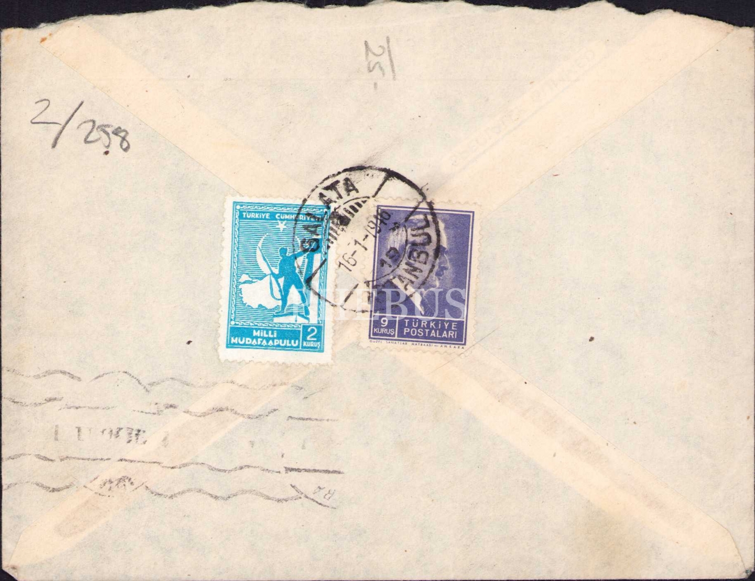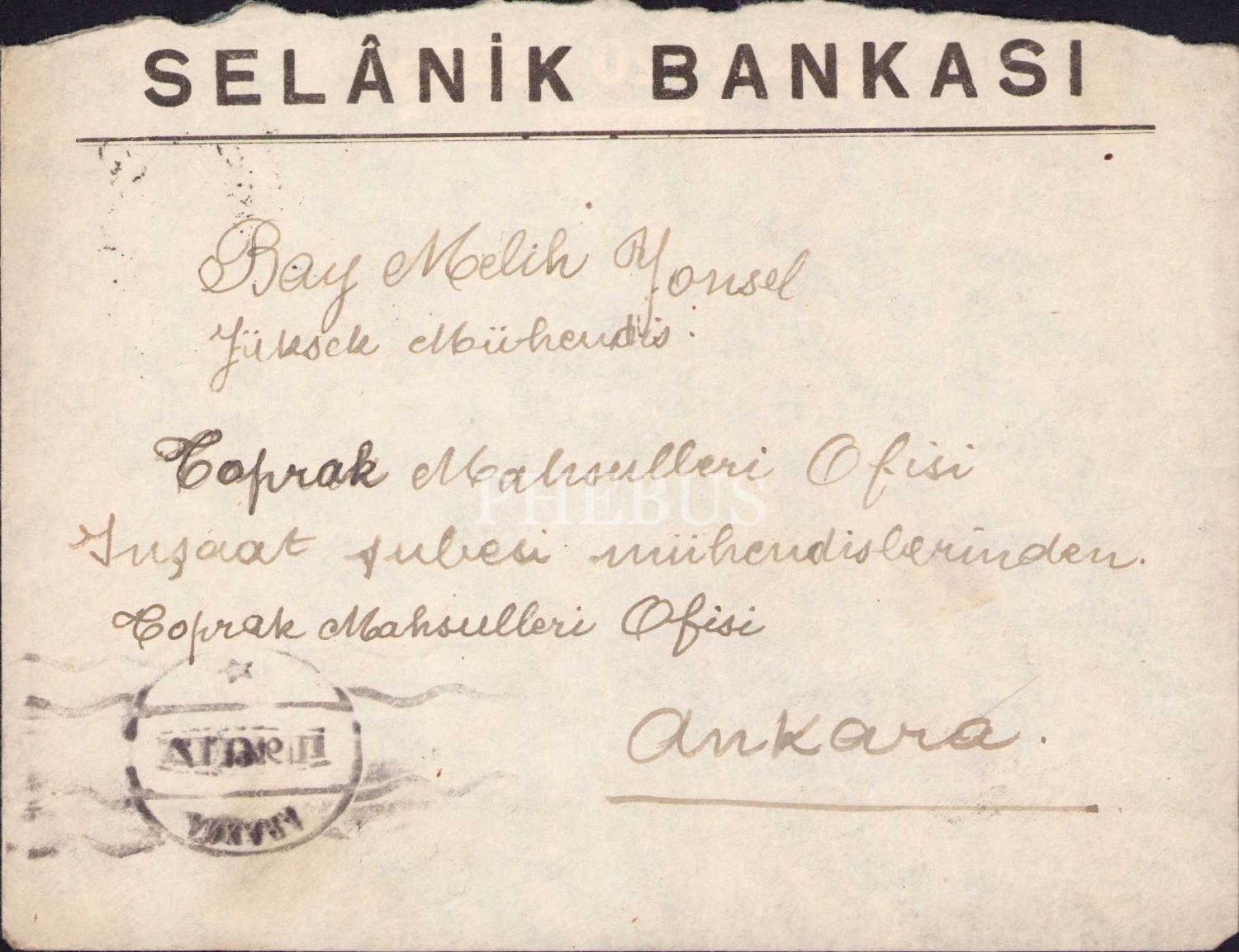 Selanik Bankası antetli postadan geçmiş zarf, içi Osmanlıca yazılı ve imzalı mektup