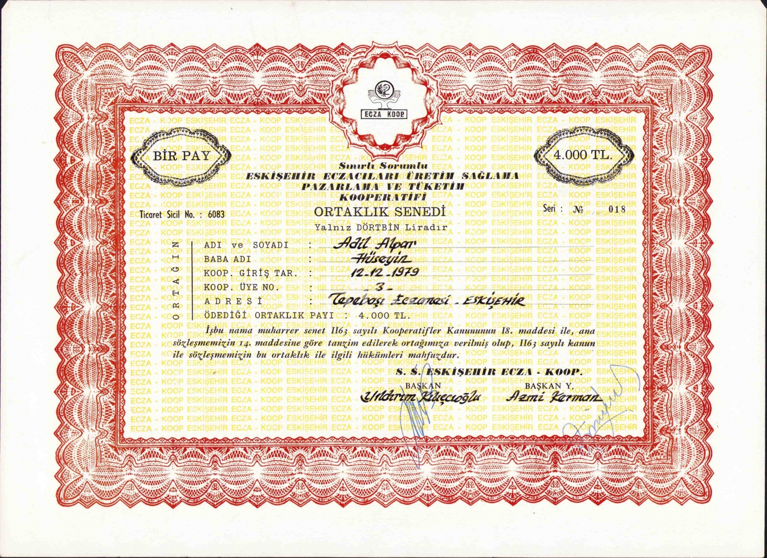 Eskişehir Eczacıları Üretim Sağlama Pazarlama ve Tüketim Kooperatifi ortaklık senedi, 1979, 31x23 cm