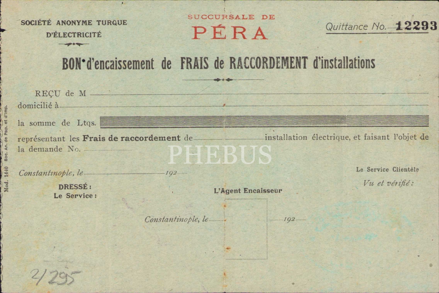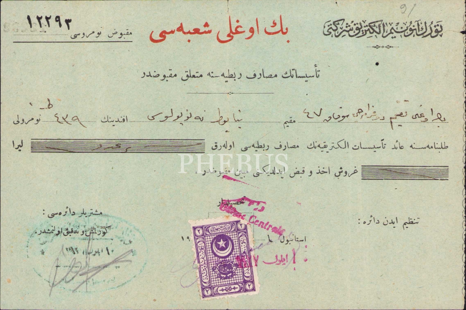 Türk Anonim Elektrik Şirketi antetli Beyoğlu şubesine ait makbuz, Osmanlıca - Fransızca, 19x13 cm