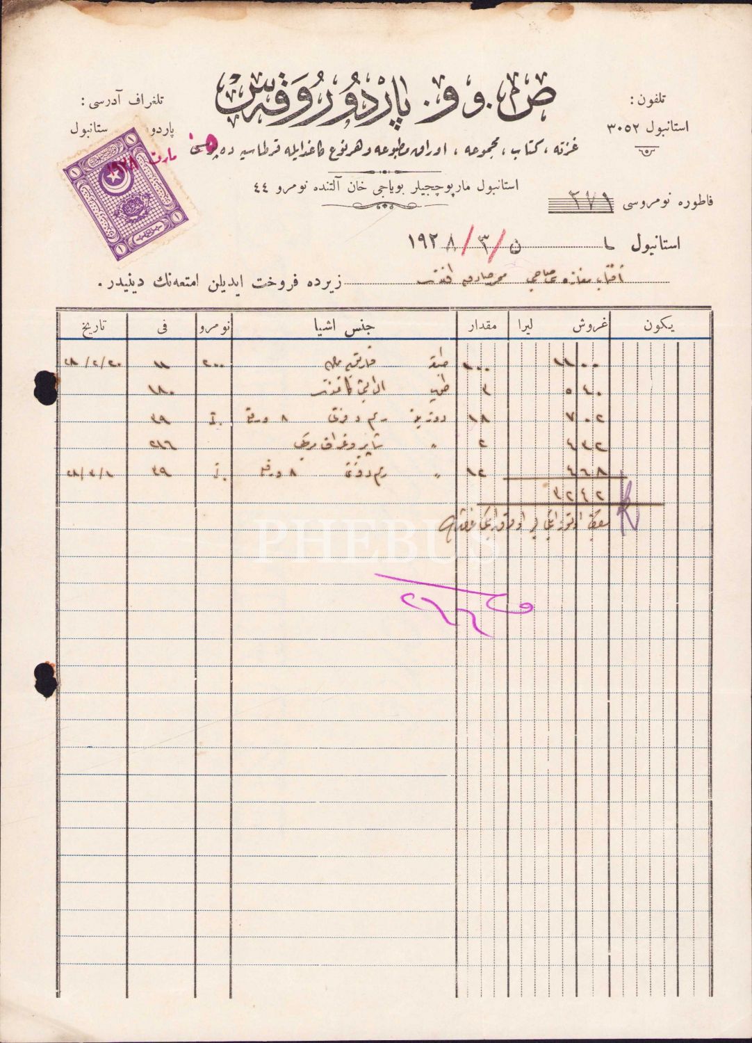 S. ve V. Pardorokes - gazete, kitap, mecmua, evrak-ı matbua ve her çeşit kağıt ve kırtasiye deposu antetli fatura, İstanbul, 1928 tarihli, 21x28 cm