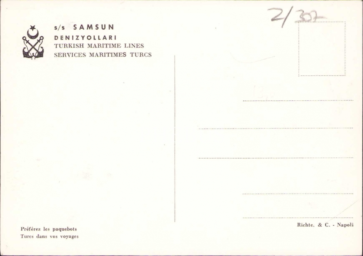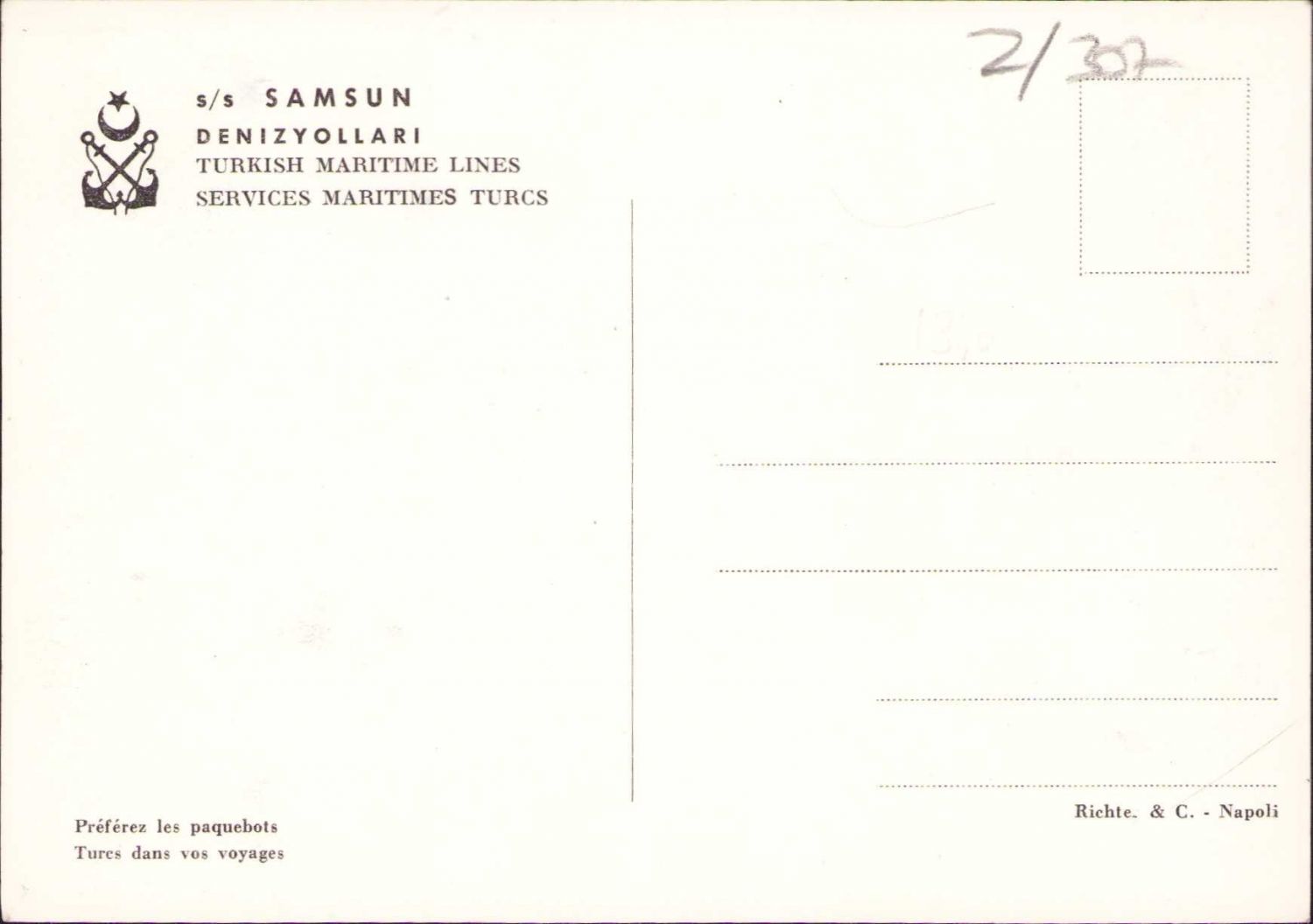 Denizyolları Samsun vapuru kartpostalı, editör Richte & C. - Napoli