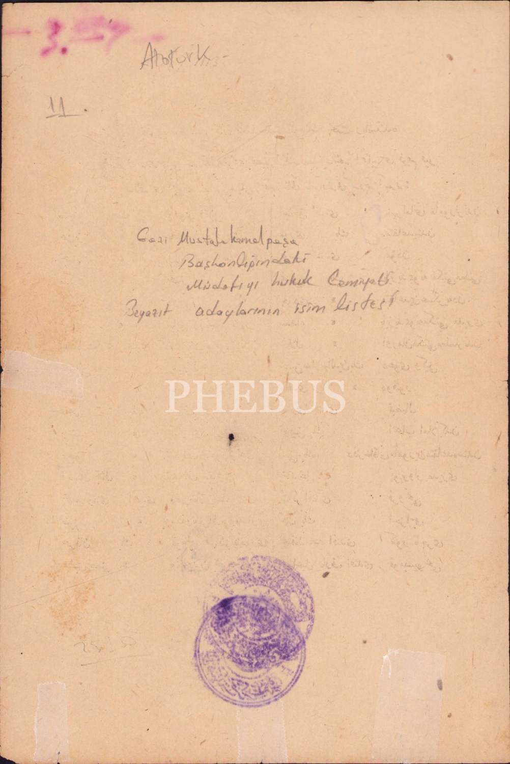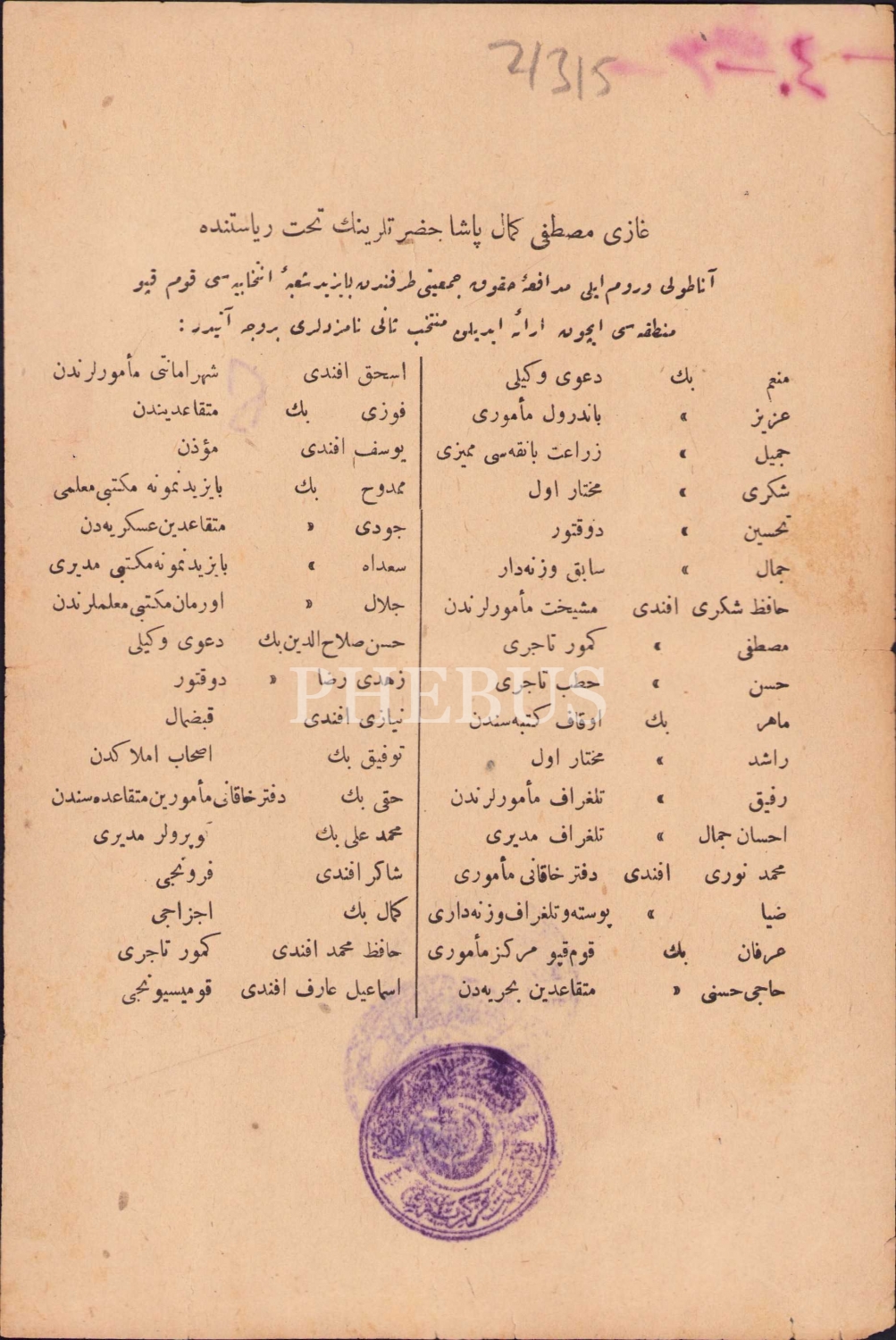 Mustafa Kemal Paşa Başkanlığındaki Müdafaa İ Hukuk Cemiyeti Beyazıt Adaylarının isim listesi, 15x23 cm