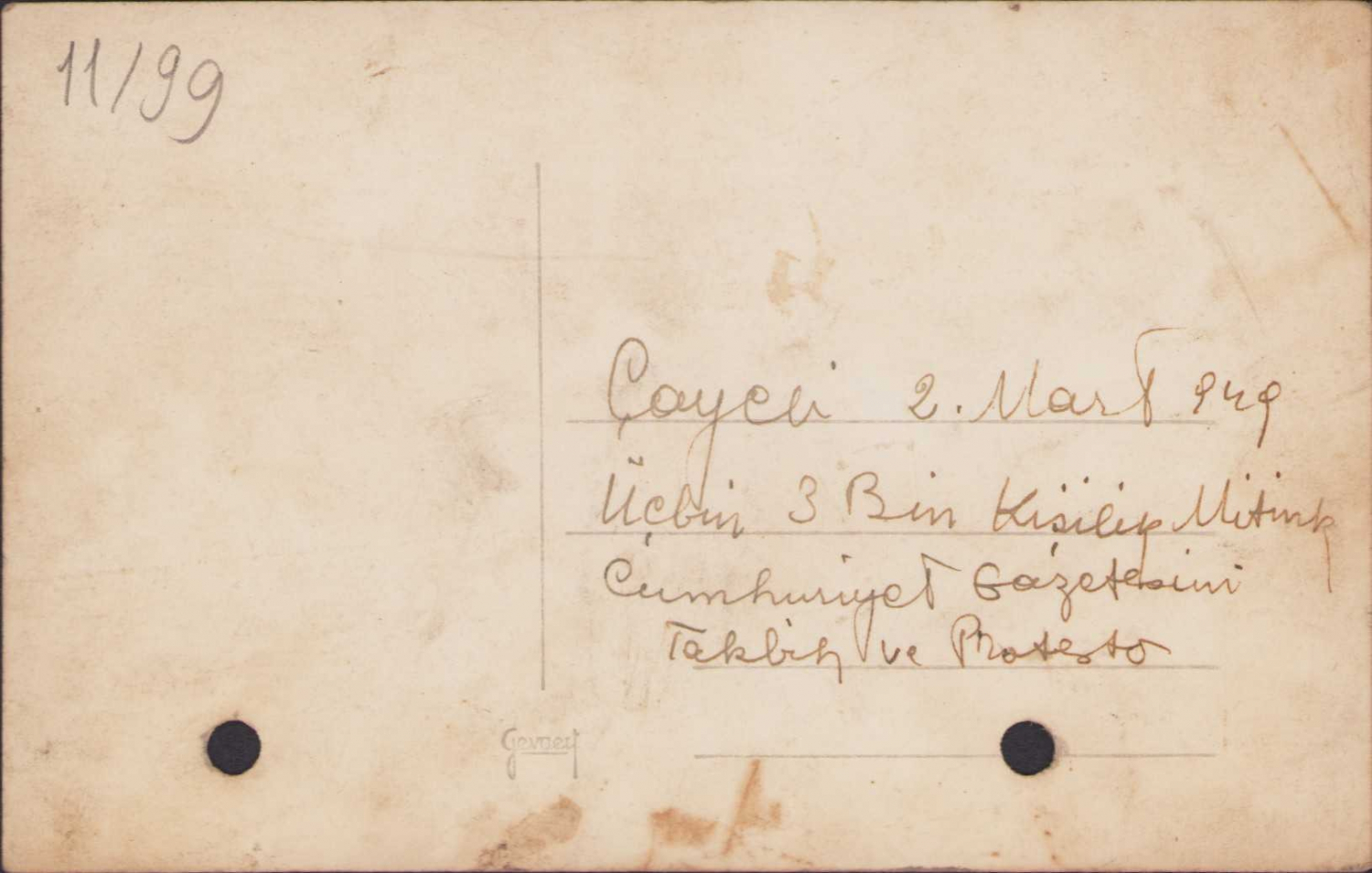 Rize Çayeli'nde 2 Mart 1949 günü üç bin kişilik bir grubun düzenlediği Cumhuriyet Gazetesi'ni kınama eylemi, delgeçle delinmiş, haliyle