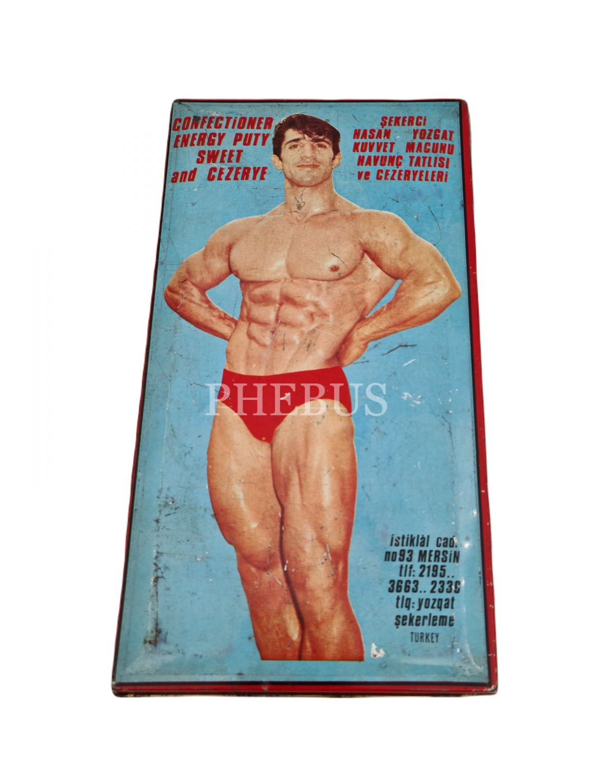Şekerci Hasan Yozgat Kuvvet Macunu Havunç Tatlısı ve Cezeryeleri Teneke Şekerleme kutusu, Mersin, 12x22x6 cm