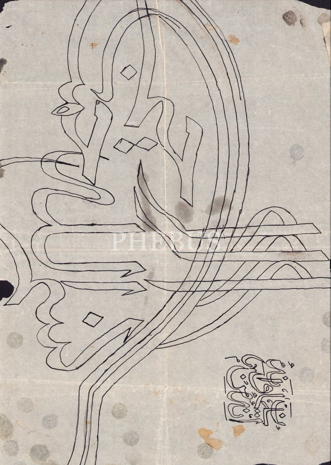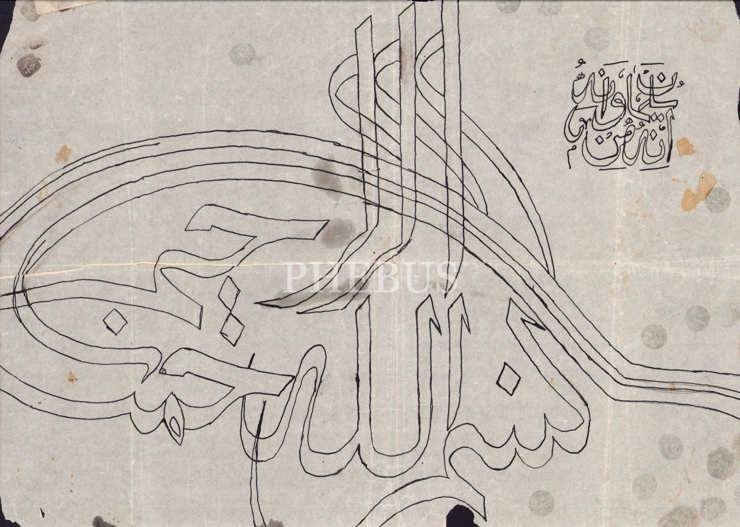 Tuğra formunda Besmele-i Şerif çalışması, eski kalıp, 'Ahmed' ve 'Subhi' mühürlü, haliyle, 50x39 cm
