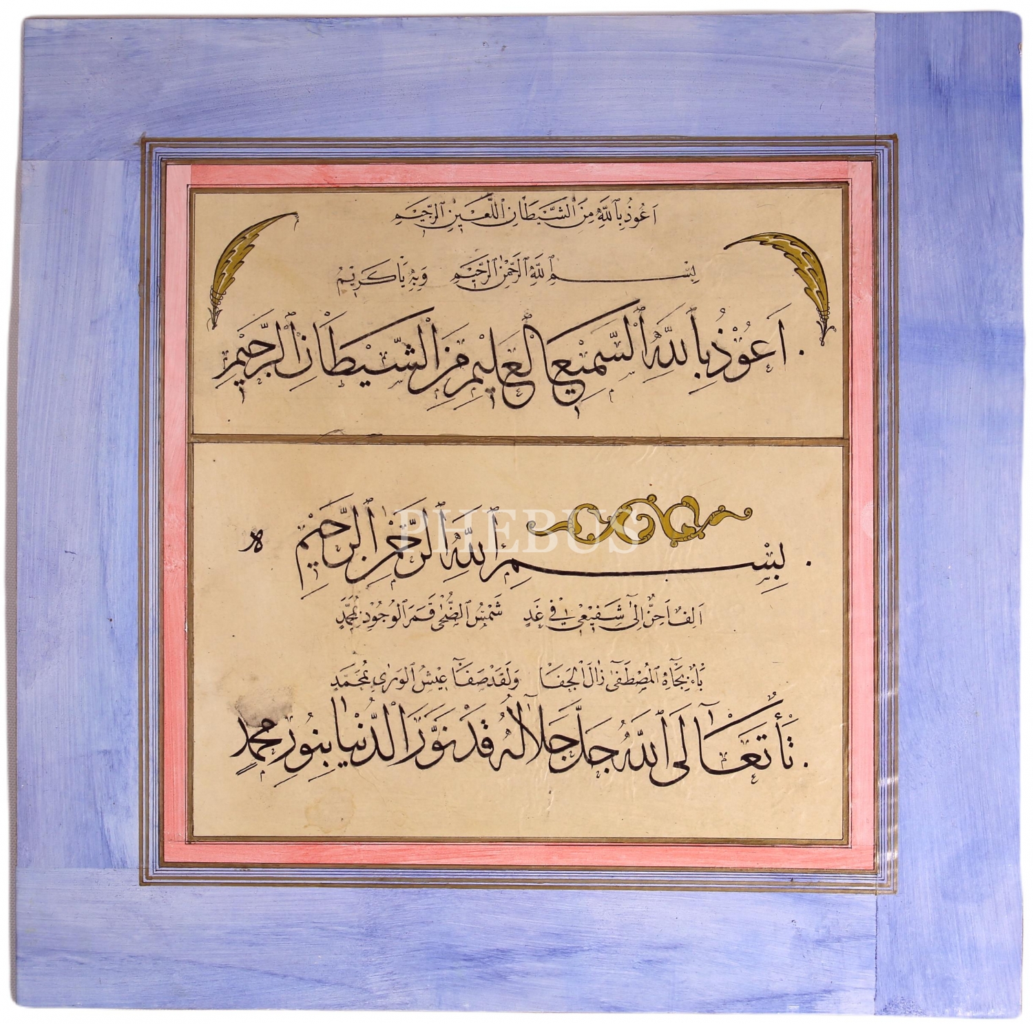 Hoca işi Sülüs Nesih yazı, 'Euzü Besmele' ve Elif Kasidesi'nin ilk bölümü, 22x24 cm