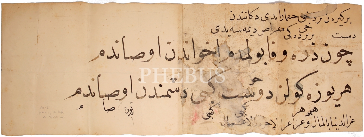 Celi Nesih meşk, "Çün zerre vefa bulmadım ihvandan usandım", tashihli ve aferinli, 70x25 cm