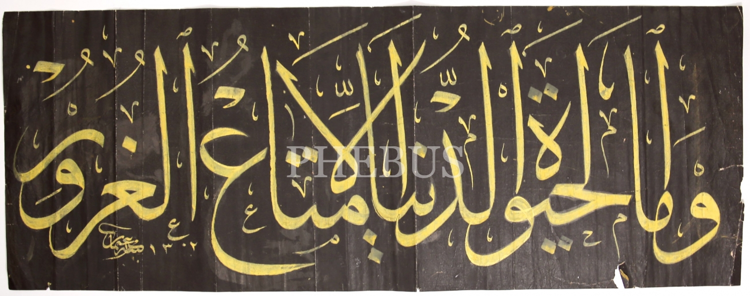 Celi Sülüs Zırnık Hat Levha, "Ve'mel Hayatu't Dünya illa metaü'l gurur", "Bu dünya aldatıcı bir metadır.", Osman Efendi ketebeli, 1302 tarihli, 75x29 cm