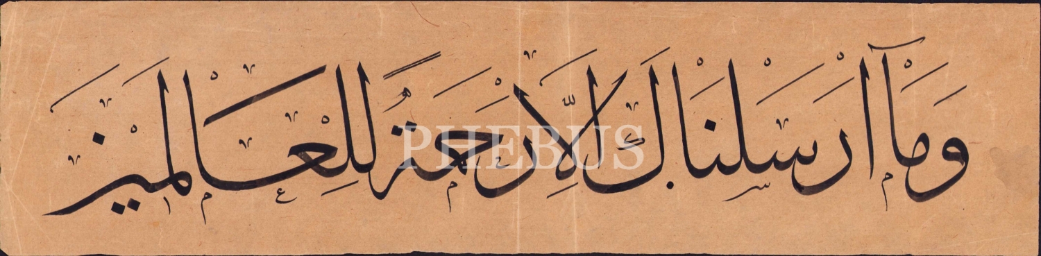 Hoca işi Sülüs Ayet-i Kerime, "Ve ma erselnake rahmeten li'l alemin","Biz seni ancak alemlere rahmet olarak gönderdik", 35,5x9,5 cm
