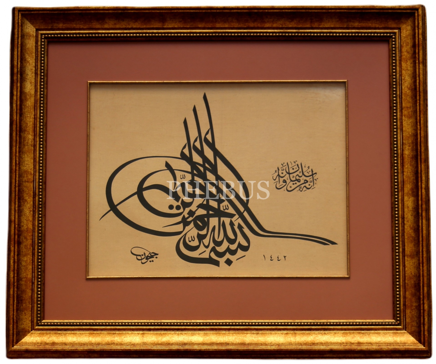 Celi Sülüs yazı, tuğra formunda 'Besmele', Ceyhun Oydem ketebeli, 1442 tarihli, çerçeveli, 43x35 cm
