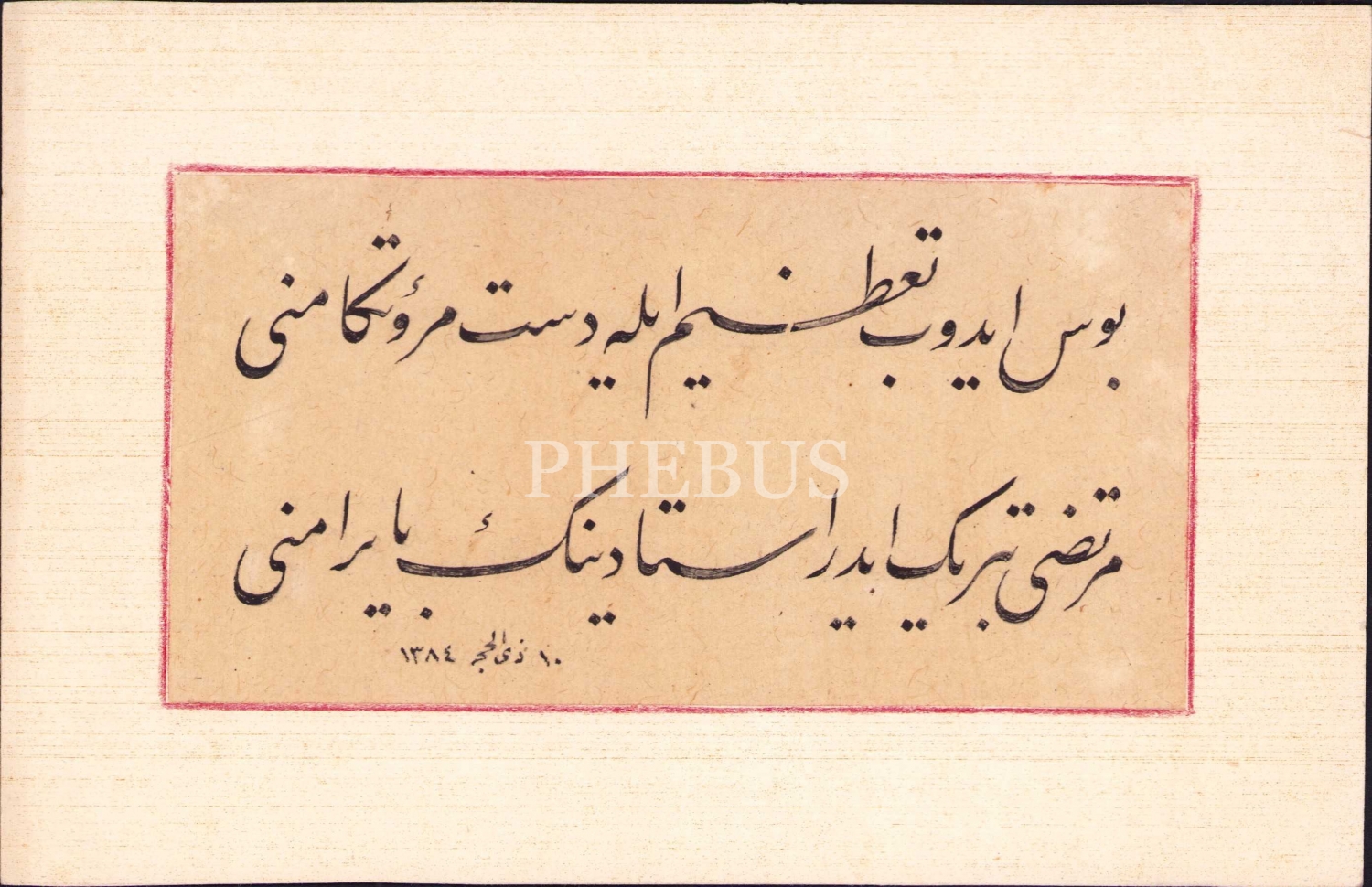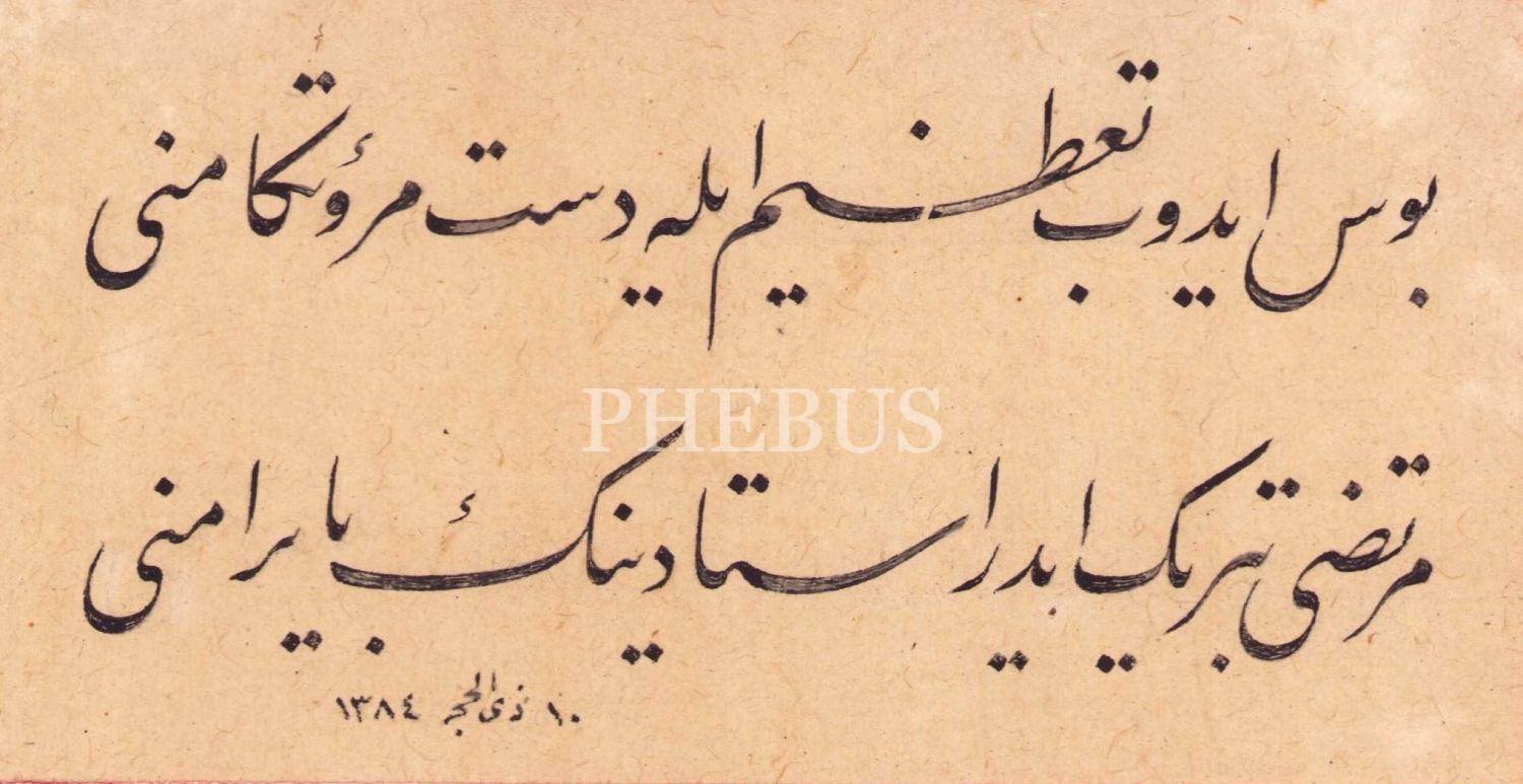 Talik şiir, "Bus edüp [Öpüp] tazim ile [hürmet ile] dest-i mürüvvetkanını/ Murteza tebrik eder Üstadının bayramını", 10 Zilhicce 1384 tarihli, 17x9 cm