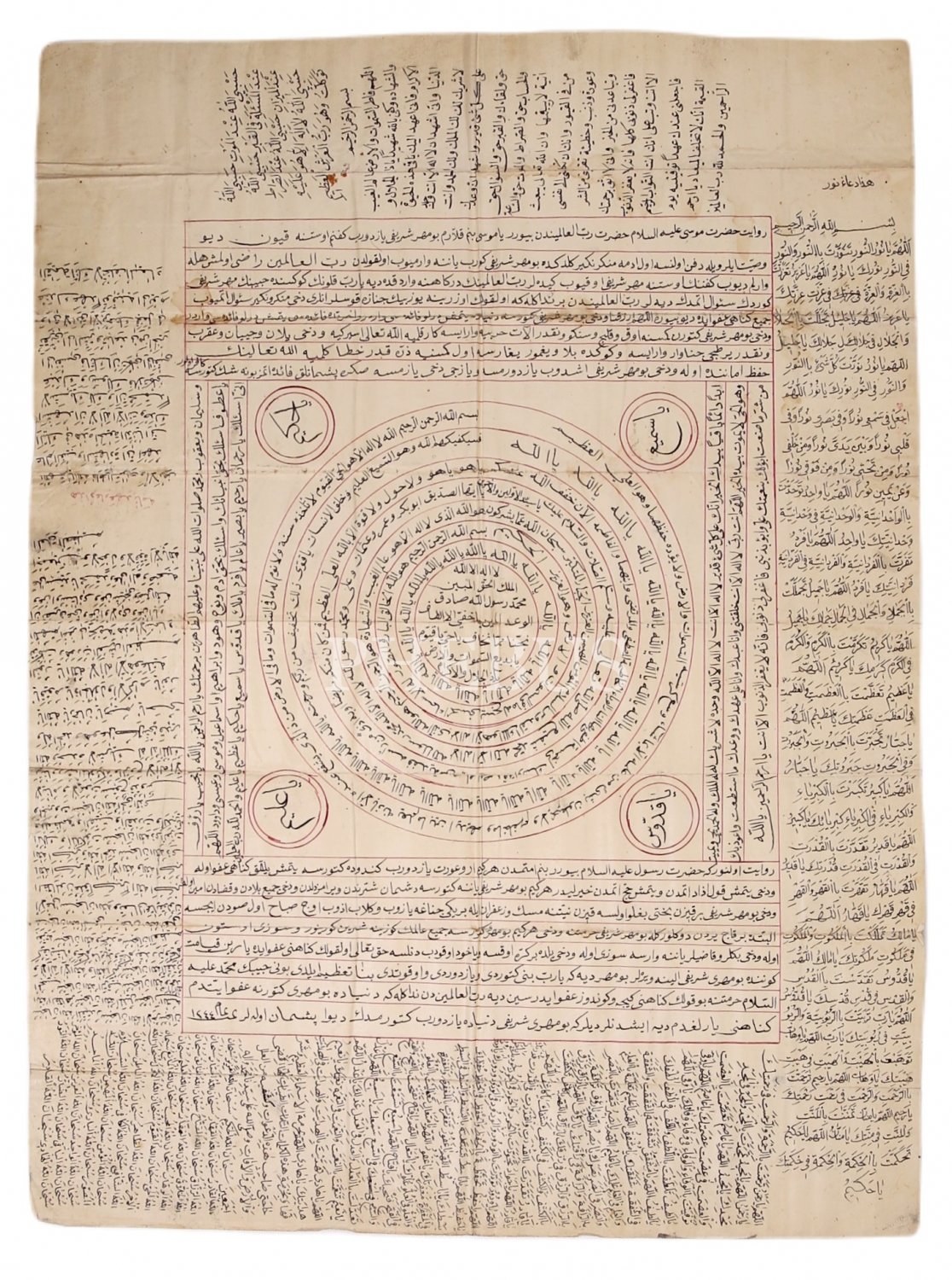Muhtelif Arapça ve Osmanlıca dualar ile Ayetel Kürsi ve Esmaü'l Hüsna'dan isimler yazılı levha, 1244 tarihli, 40x70 cm