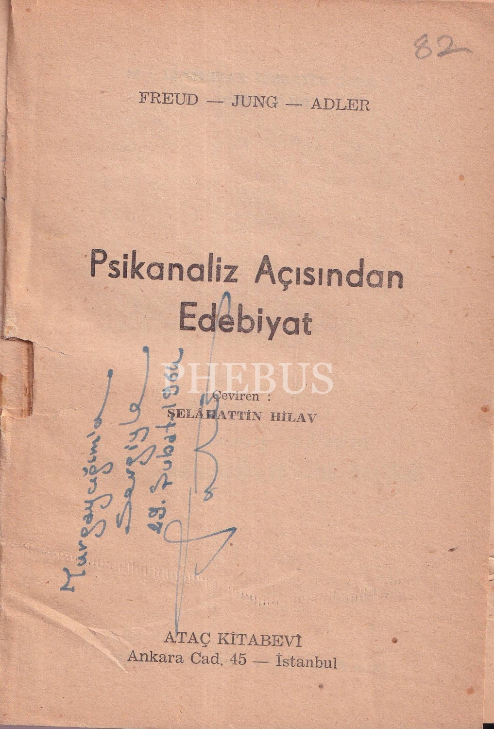 Psikanaliz Açısından Edebiyat, Freud - Jung - Adler, çev.i Selahattin Hilav, İstanbul, Selahattin Hilav tarafından Turgay Gönenç'e ithaflı, imzalı, 78 sayfa, 11x15 cm