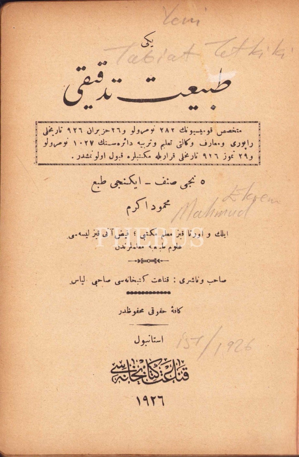 Osmanlıca Yeni Tabiat Tedkiki ve Hıfzıssıhha, Beşinci sınıf - Yeni baskı, Türk Matbaası, İstanbul, 1926, resimli, 160 sayfa, 13x19 cm