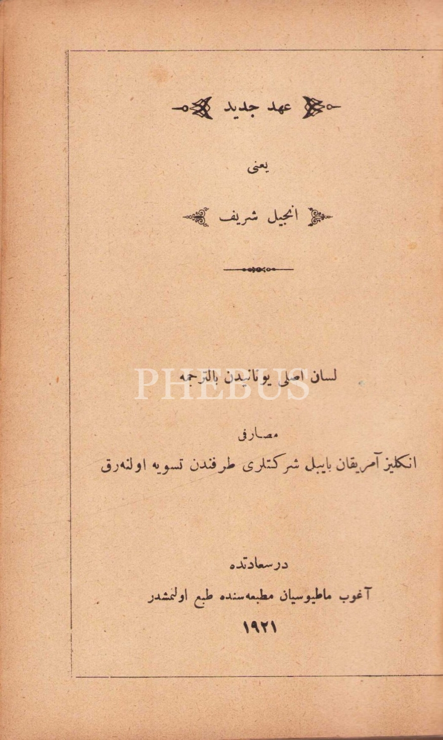 Osmanlıca Ahd-i Cedid Yani İncil-i Şerif, Yunancadan tercüme, İngiliz Amerikan Bible Şirketi tarafından neşr olunmuştur, Agop Matosyan Matbaası, Dersaadet, 1921, 636 sayfa, 12x36 cm