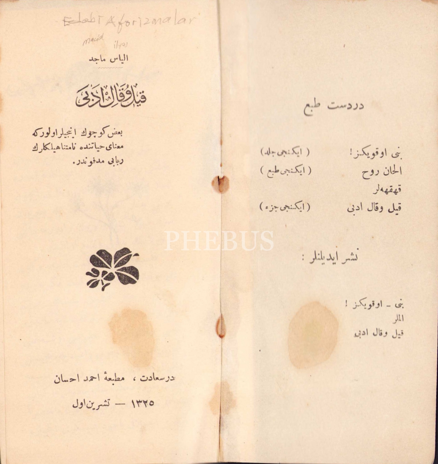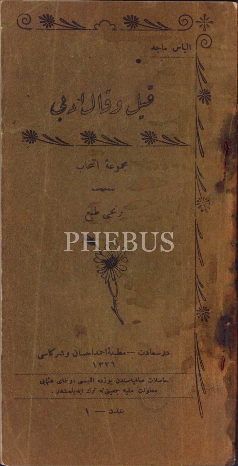 Osmanlıca Kıyl u Kal-i Edebi, İlyas Macid, birinci baskı, Matbaa-i Ahmed İhsan Matbaası, Dersaadet, 1326, 44 sayfa, 8x15 cm