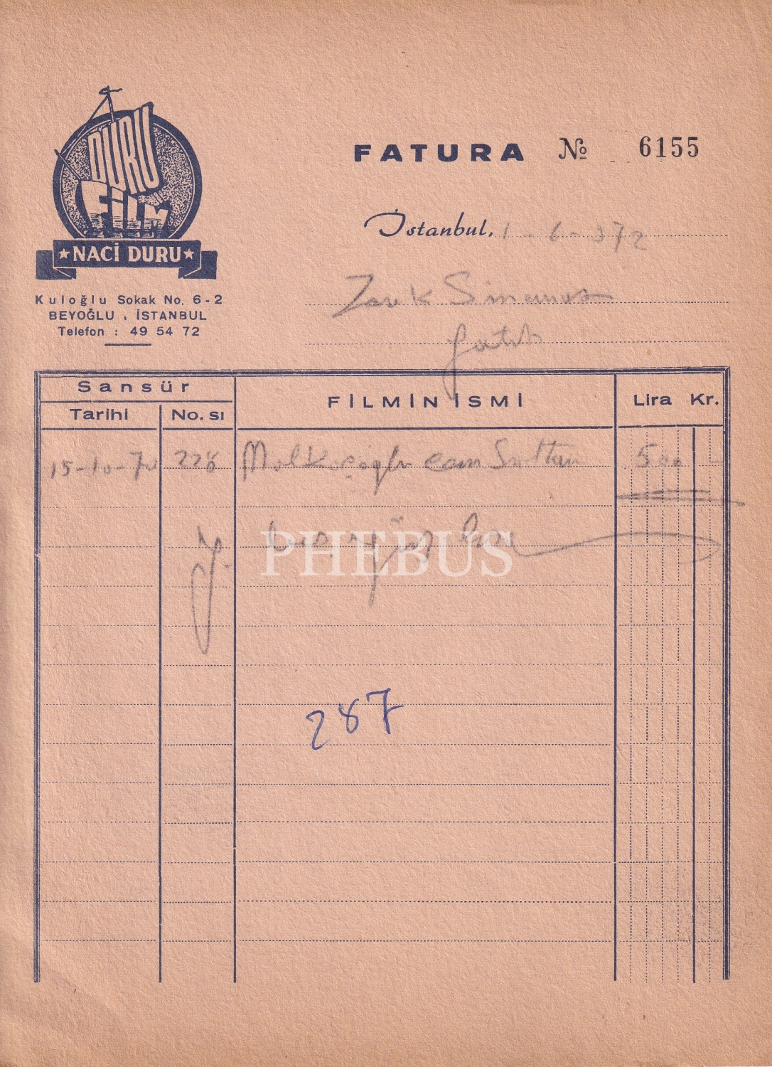 Duru Film Malkoçoğlu Cem Sultan Filmi Faturası