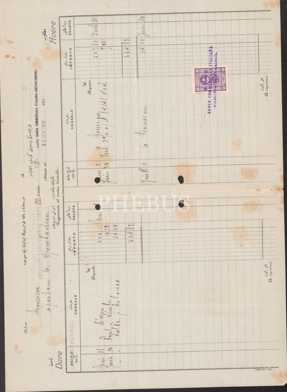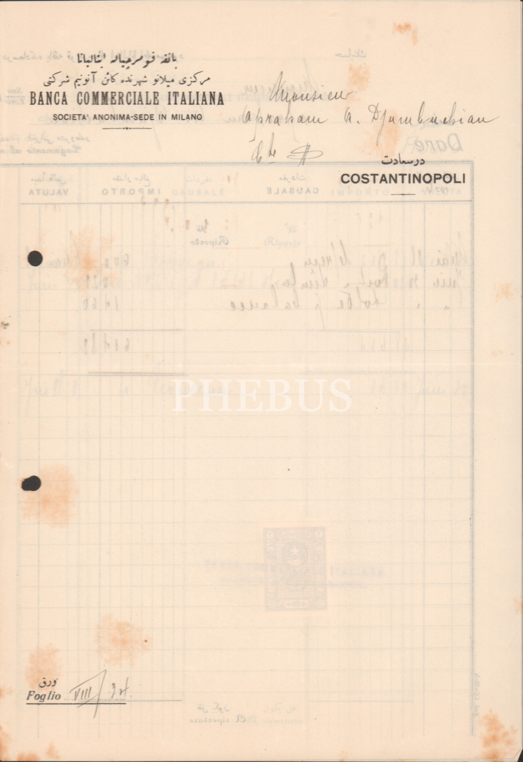 Osmanlıca Constantinople Banca Commerciale İtaliana Ermeni Tüccar Abraham Djumbuchian'a Verilmiş Hesap Bordrosu