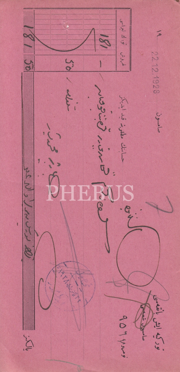 Osmanlıca Türkiye İş Bankası Samsun Şubesi Makbuzu