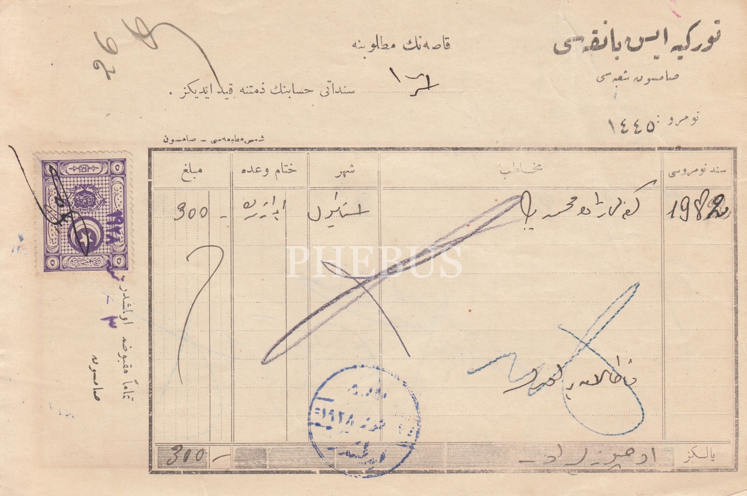 Osmanlıca Türkiye İş Bankası Samsun Şubesi Makbuzu