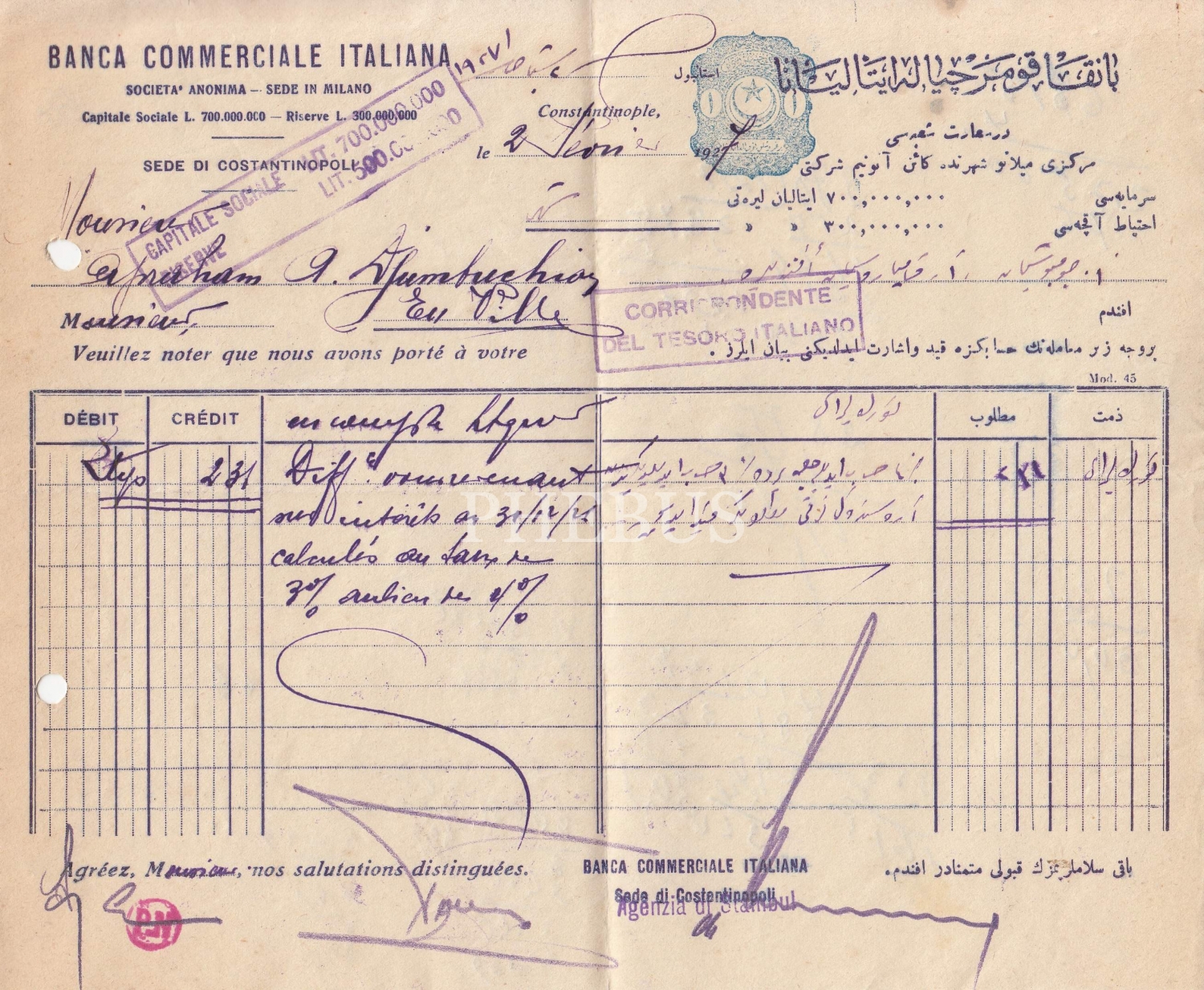 Osmanlıca Constantinople Banca Commerciale İtaliana Ermeni Tüccar Abraham Djumbuchian'a Verilmiş Hesap Bordrosu