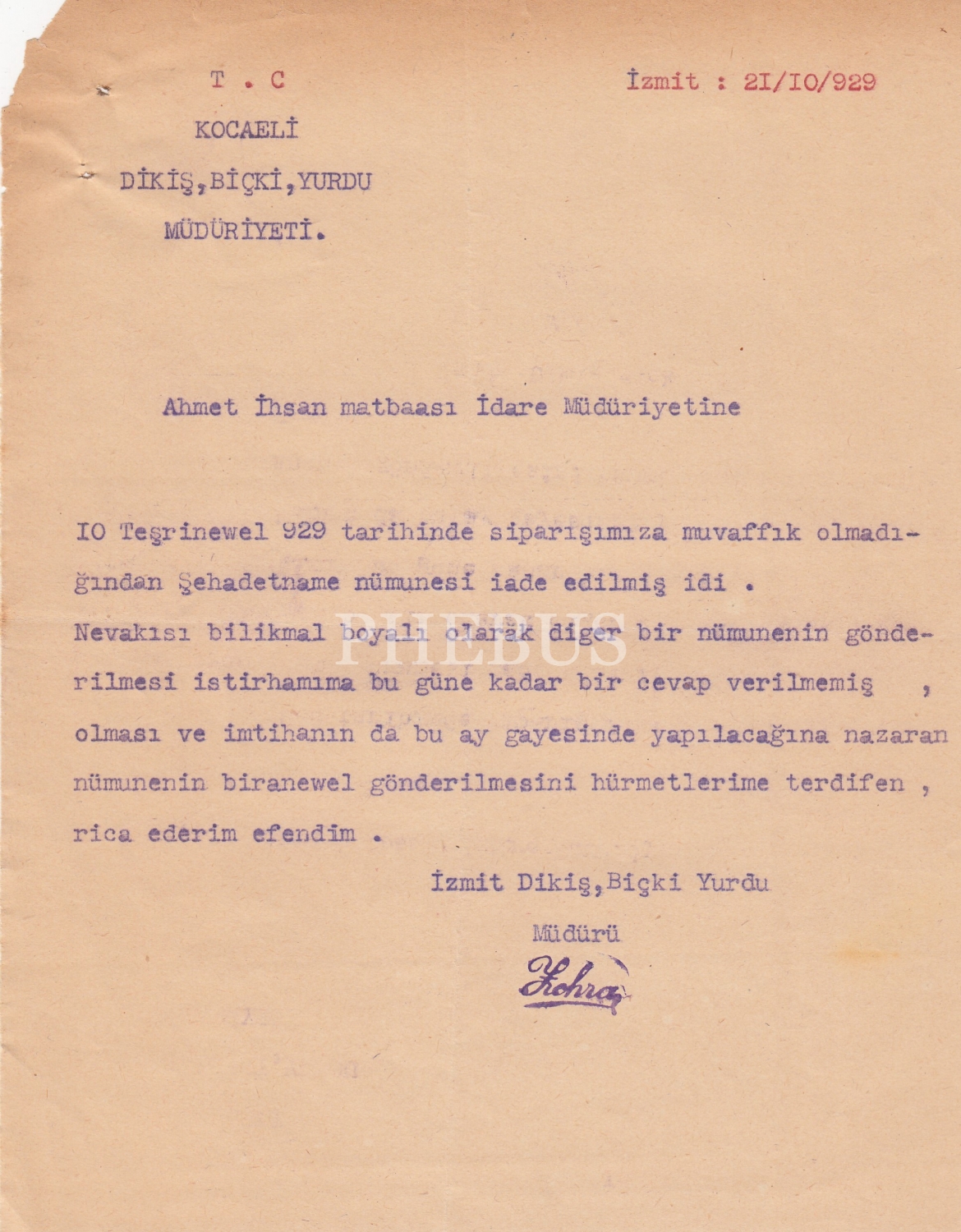 İzmit Dikiş Biçki Yurdu Müdürü İmzalı Mektup 1929