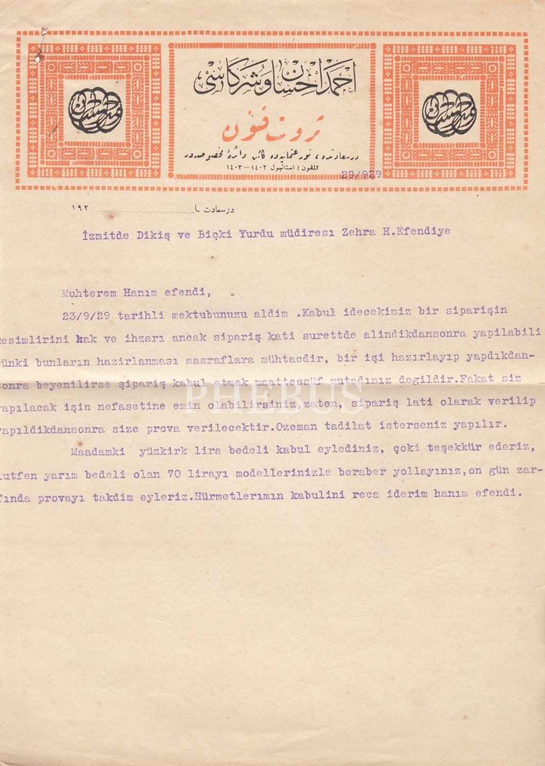 Osmanlıca Ahmed İhsan ve Şürekası Antetli İzmit Dikiş Biçki Yurdu Müdürüne Gönderilmiş Evrak