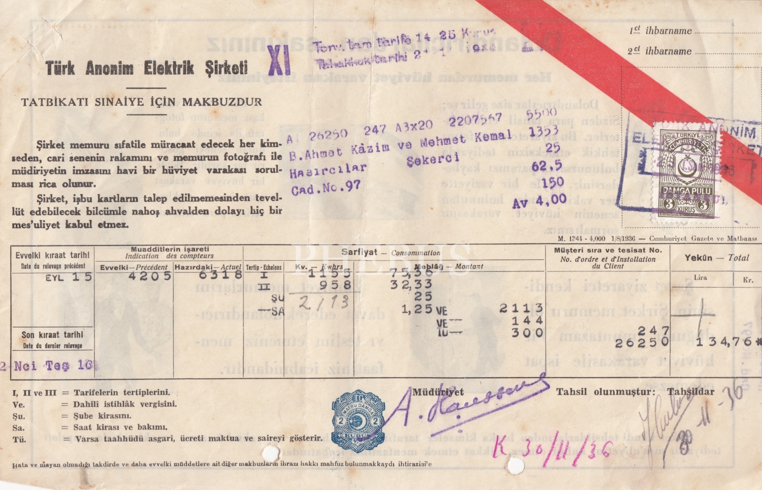 Türk Anonim Elektrik Şirketi Fiskal Pullu Makbuz