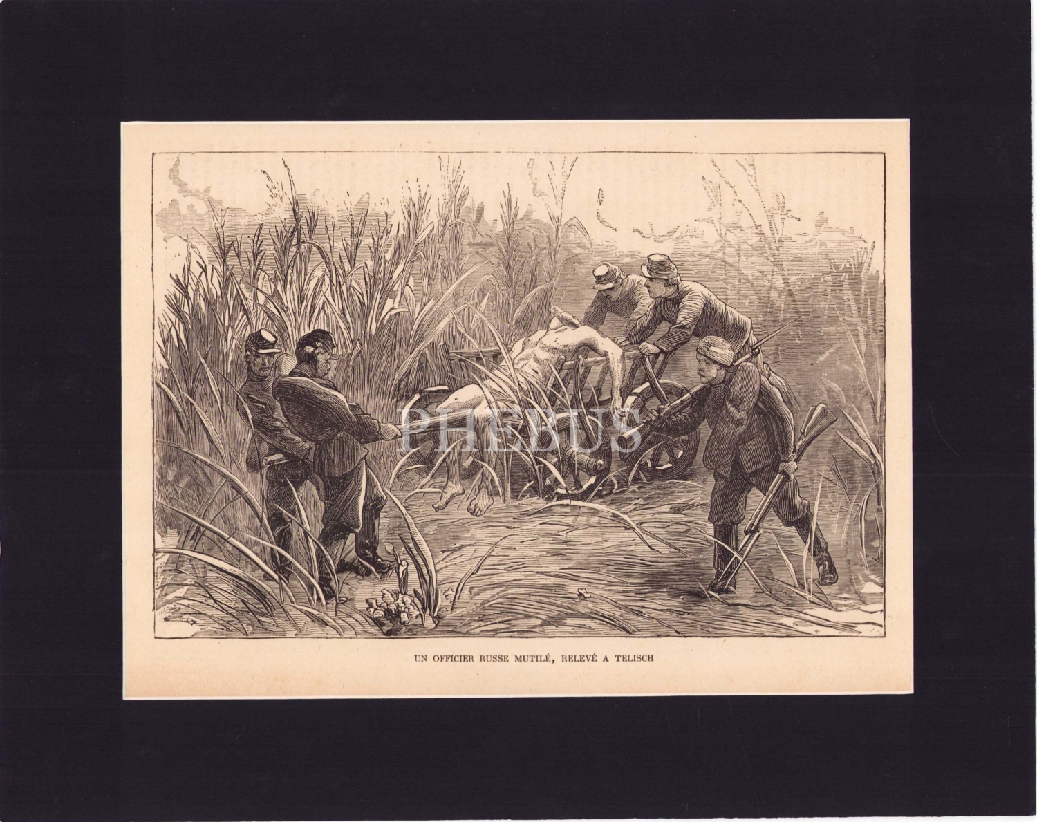 Osmanlı dönemi gravür, Türk - Rus Savaşı, 1877, Parçalanmış Bir Rus Subayı, dergiden kesilmiş, 31x25 cm