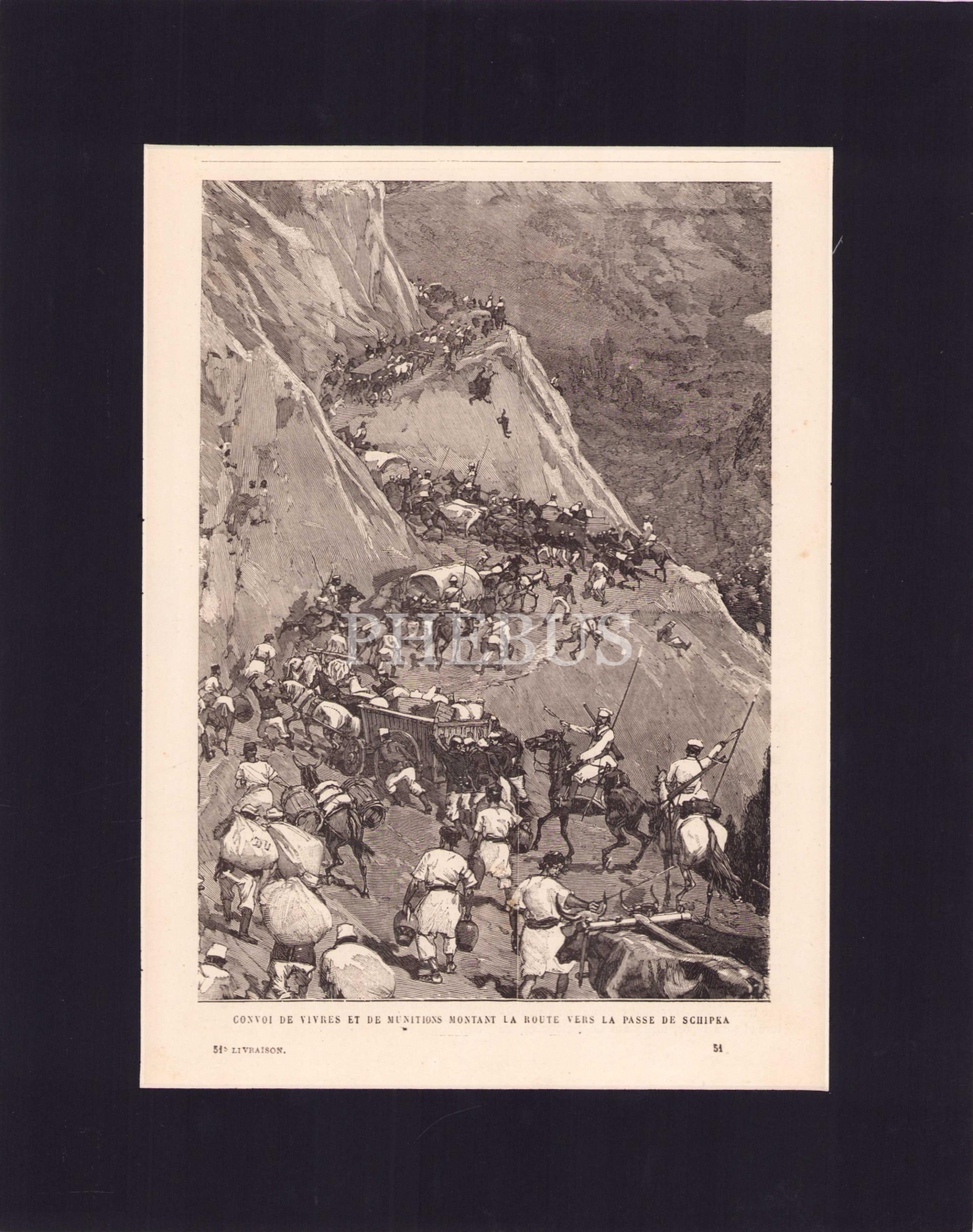 Osmanlı dönemi gravür, Türk - Rus Savaşı, 1877, Yiyecek ve Mühimmat Konvoyu Şıpka [Bulgaristan] Geçidine Giden Yolda, dergiden kesilmiş, 17x24 cm