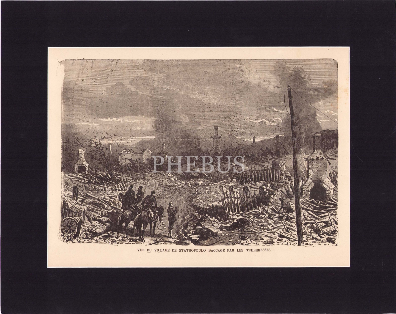 Osmanlı dönemi gravür, Türk - Rus Savaşı, 1877, Çerkeslerin yağmaladığı Stathopoulo köyünün görünümü, dergiden kesilmiş, 23x19 cm