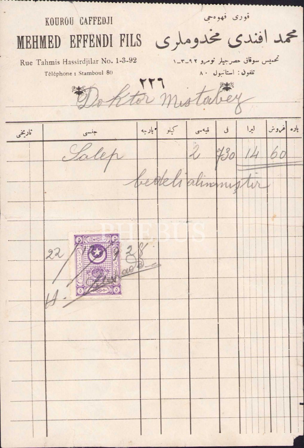 Osmanlıca Fransızca Kuru Kahveci Mehmed Efendi Mahdumları antetli fatura, İstanbul, 1928, 14x20 cm