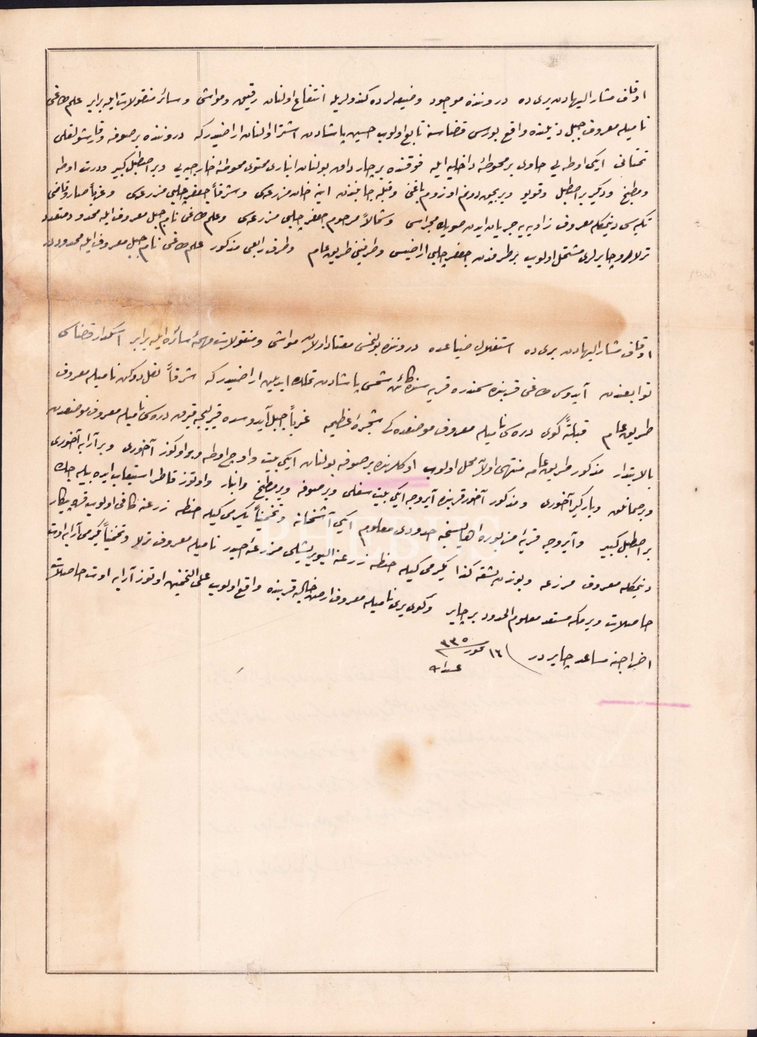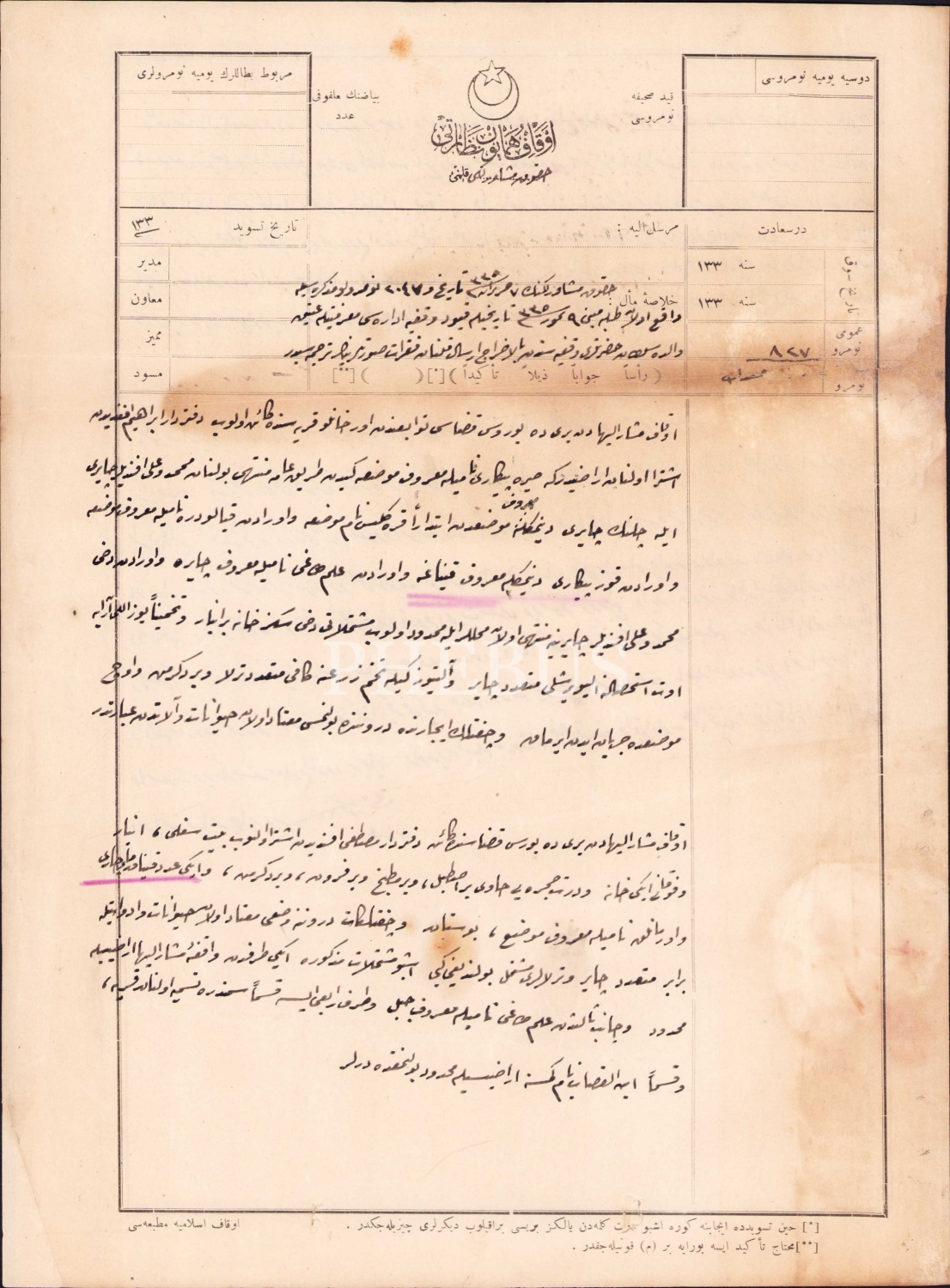 Osmanlıca Evkaf-ı Hümayun Nezareti Hukuk Müşavirliği Kalemi, Yoros kazası Orhanlı karyesinde arsaların satışı ile ilgili evrak 1325, tamirli, haliyle, 25x34 cm