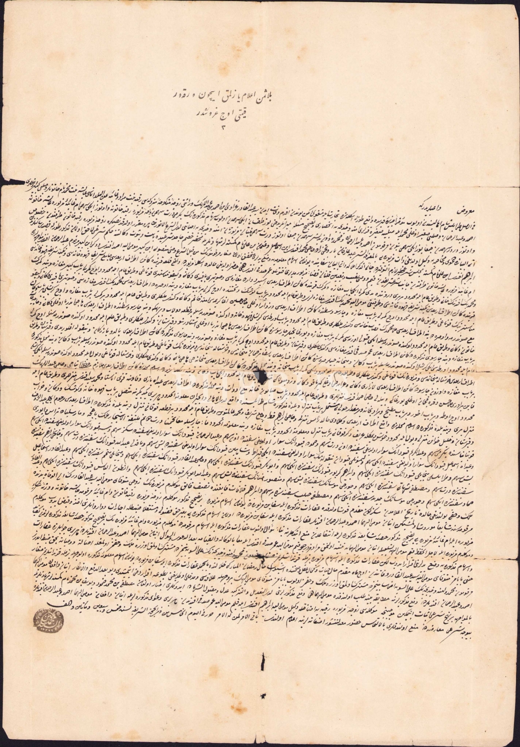 Trablusgarp asıllı Tuzla iskelesi tüccarlarından Abdülkadir Bey'in vefatı üzerine terekesinin zevcesi ve oğlu arasındaki paylaşımı, kenarları yırtık, 25x40 cm