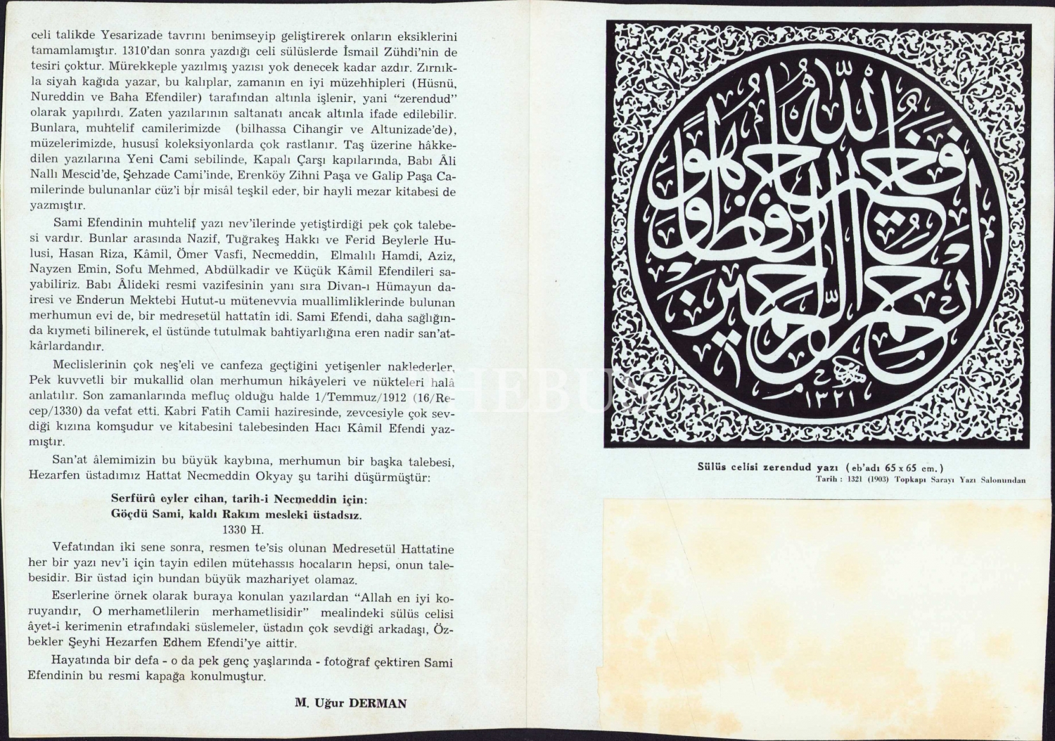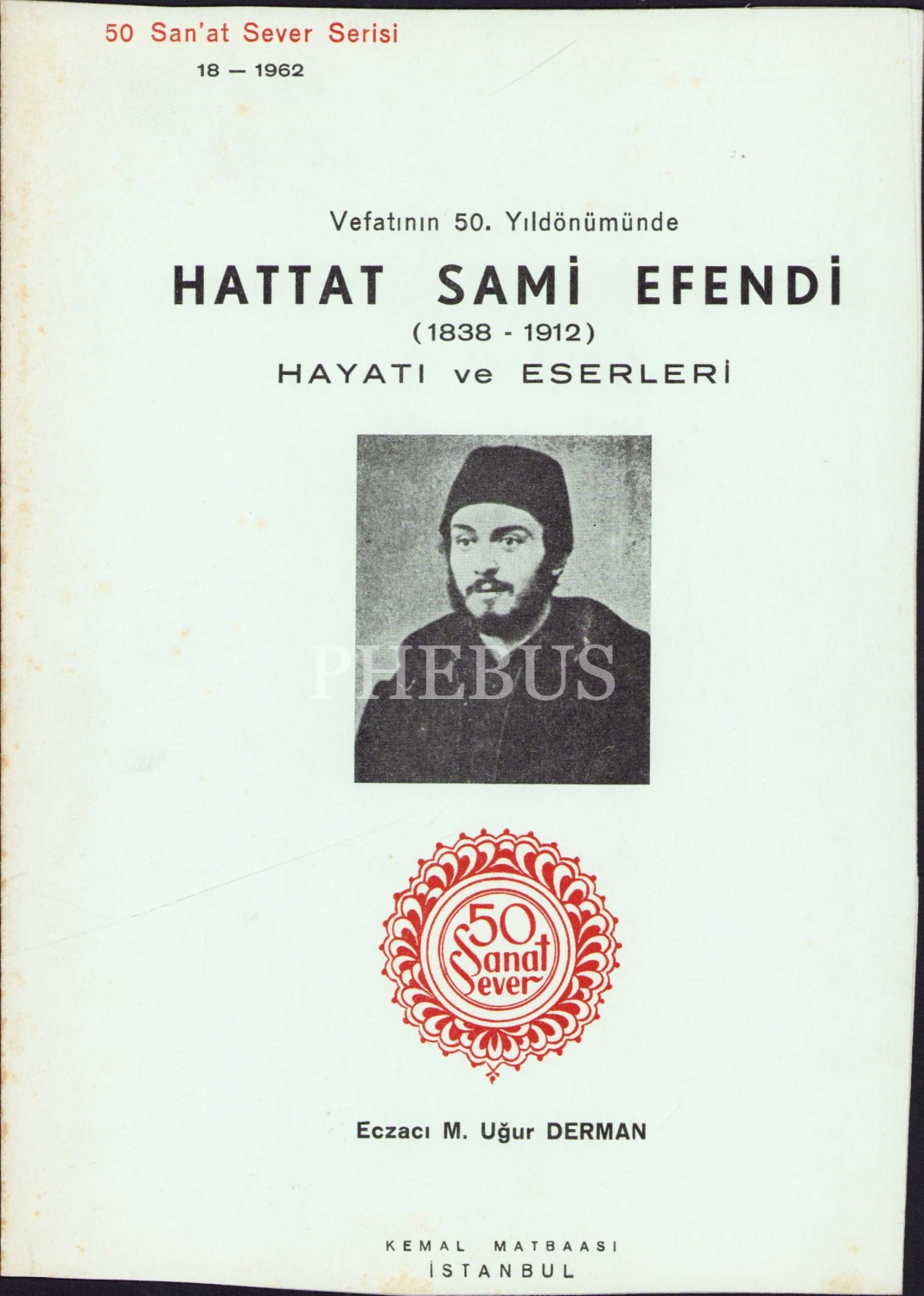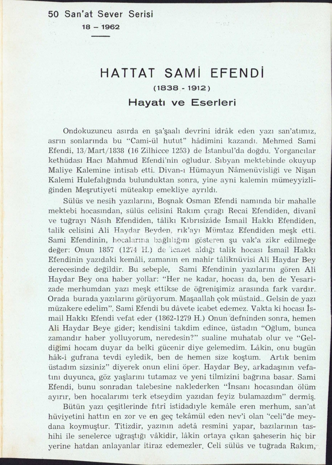 50 Sanat Sever Serisi 18: Hattat Sami Efendi Hayatı ve Eserleri, Uğur Derman, Kemal Matbaası, İstanbul, 1962, bir sayfanın yarısı yok, 3 sayfa, 14x20 cm
