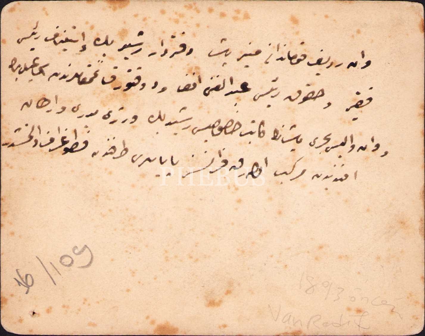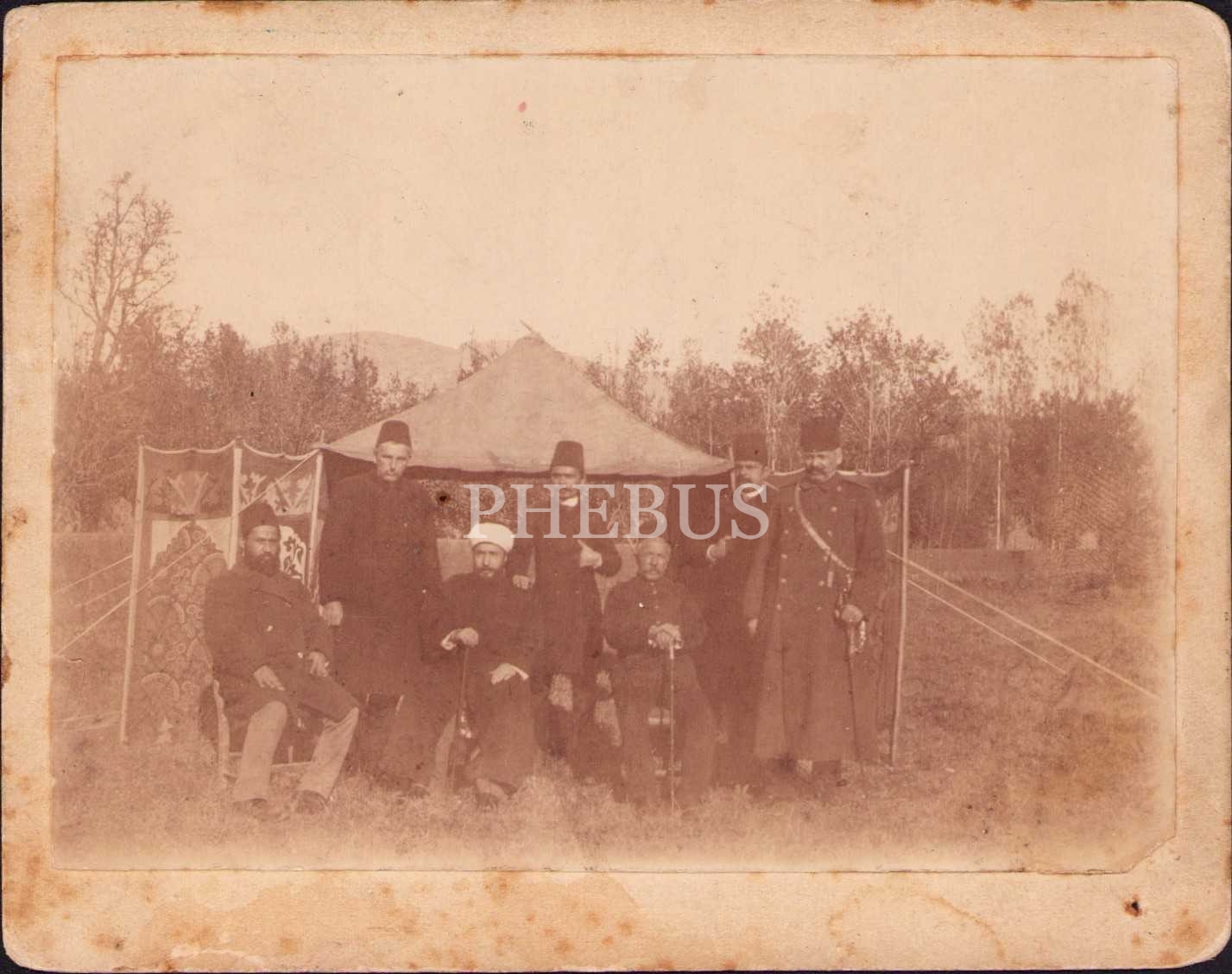 Van Redif Kumandanı Münir Bey, Defterdar Reşid Bey, İstinaf Reisi, Hukuk Reisi Abdülgani, Doktor Kaymakam İsmail Bey ve Van Valisi Bahri Paşa'nın katib-i hususisi Reşid Bey, Fransız Papazları tarafından çekilmiş hatıra fotoğrafı, 10x8 cm