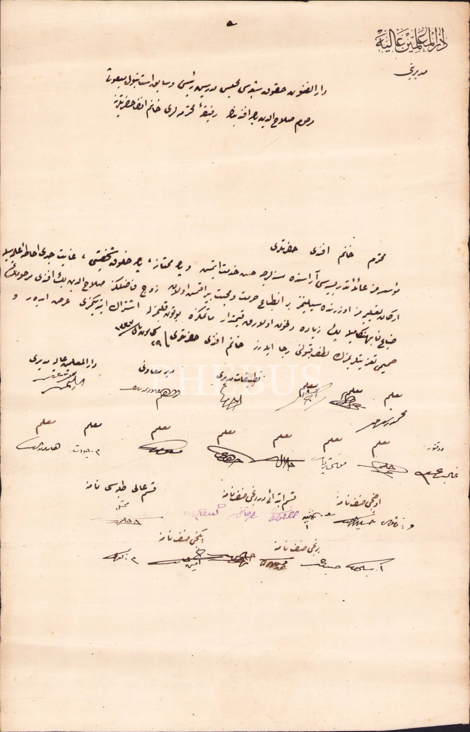 Darülmuallim-i Aliyye Müdüriyeti antetli, müdür ve muallimler tarafından imzalı Osmanlıca evrak, 1337 tarihli, 20x32 cm