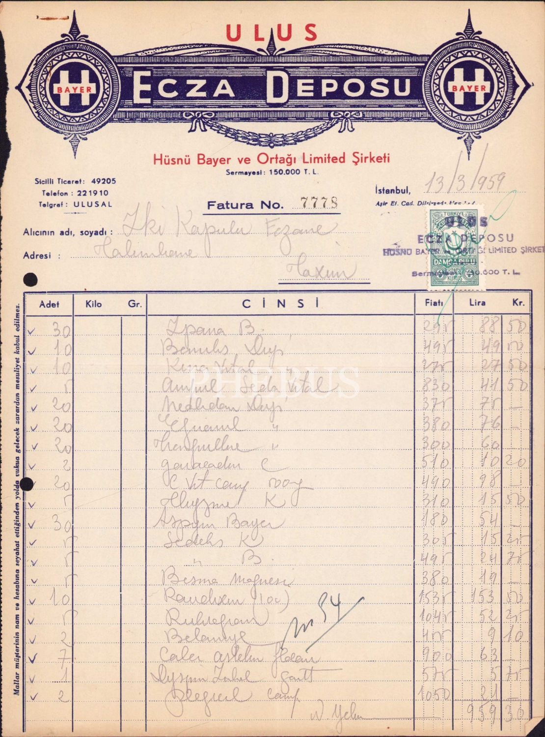 Ulus Ecza Deposu Hüsnü Bayer ve Ortağı Limited Şirketi antetli fatura, 1959, İstanbul, 21x26 cm