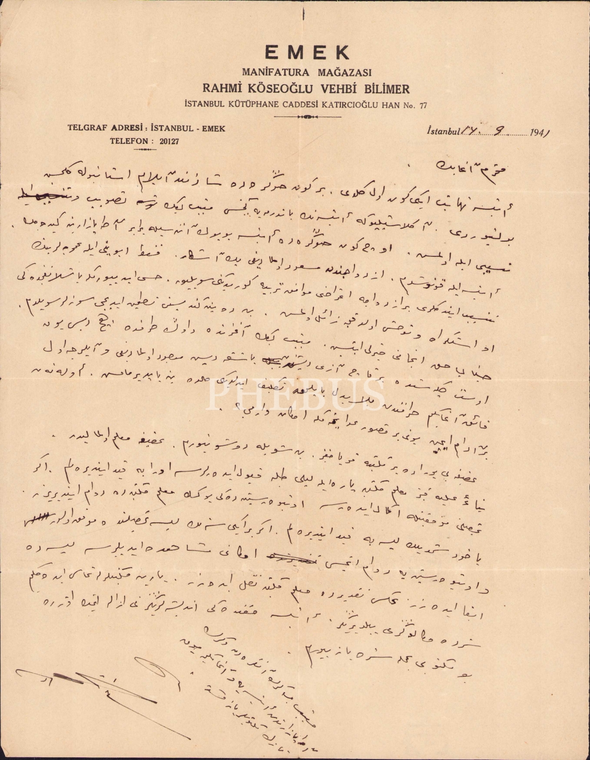 Emek Manifatura Mağazası Rahmi Köseoğlu Vehbi Bilimler antetli Osmanlıca doküman, İstanbul 1941, 22x29 cm