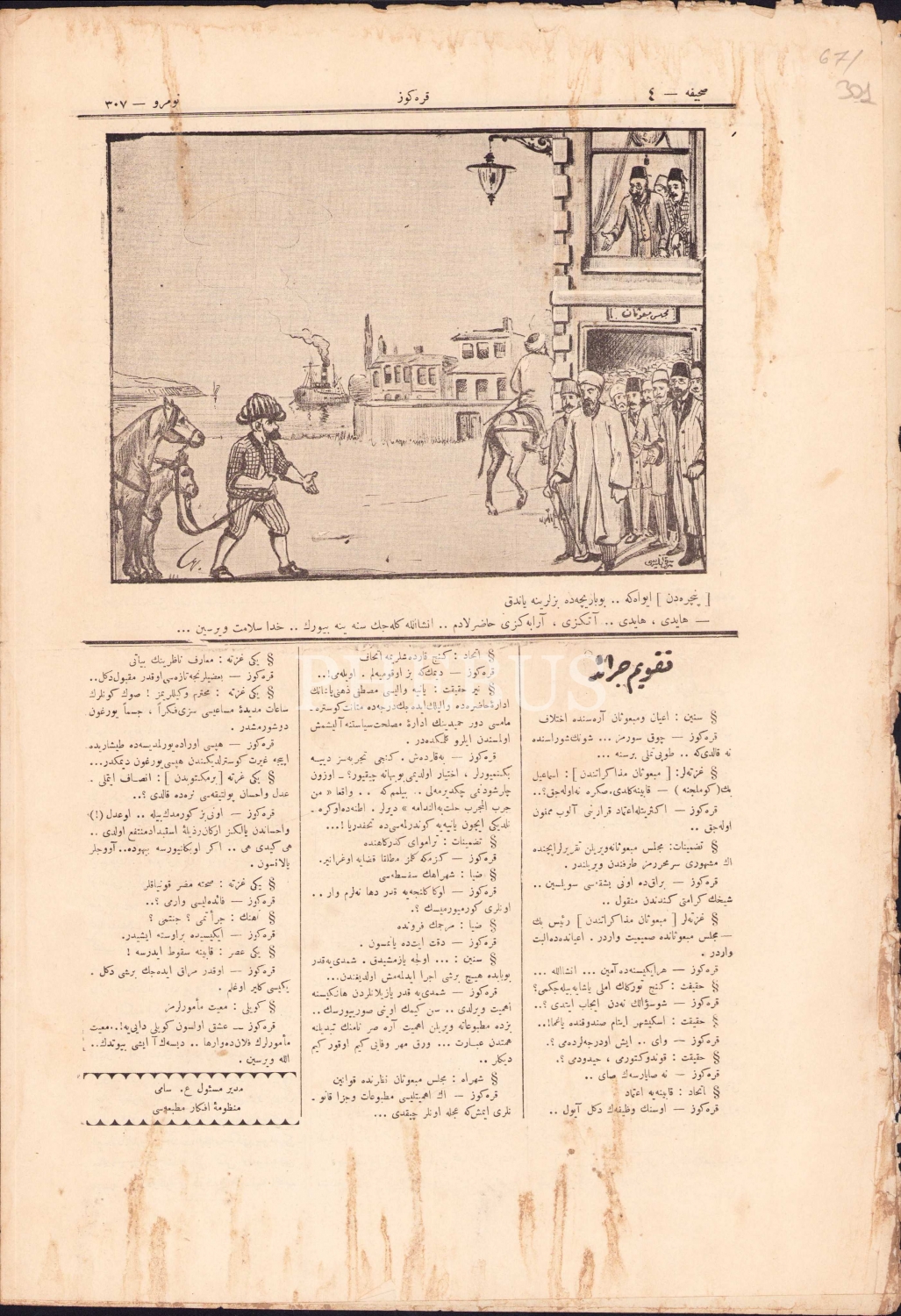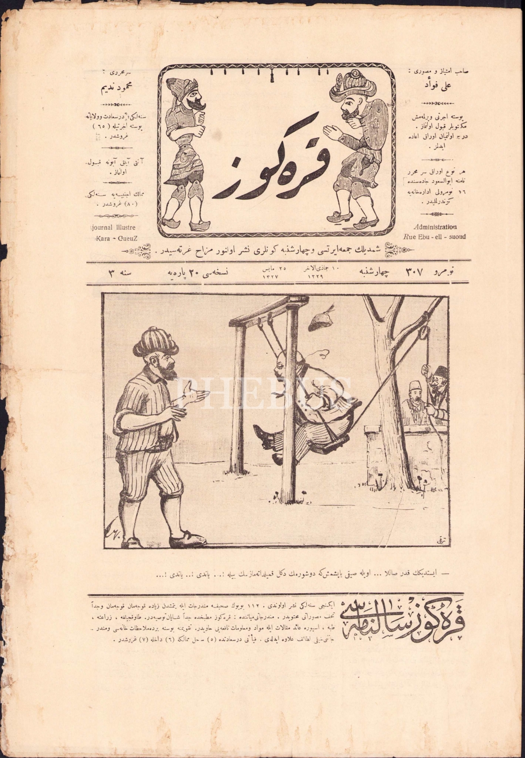 Osmanlıca Karagöz mizah gazetesi, muharriri Mahmud Nedim, 1327 tarihli, "İstediğin Kadar Sallan... Öyle Saki Yaşamış ki Düşürmek Değil Kımıldatamazsın Bile!..Yandı Yandı.."4 sayfa, 28x40 cm