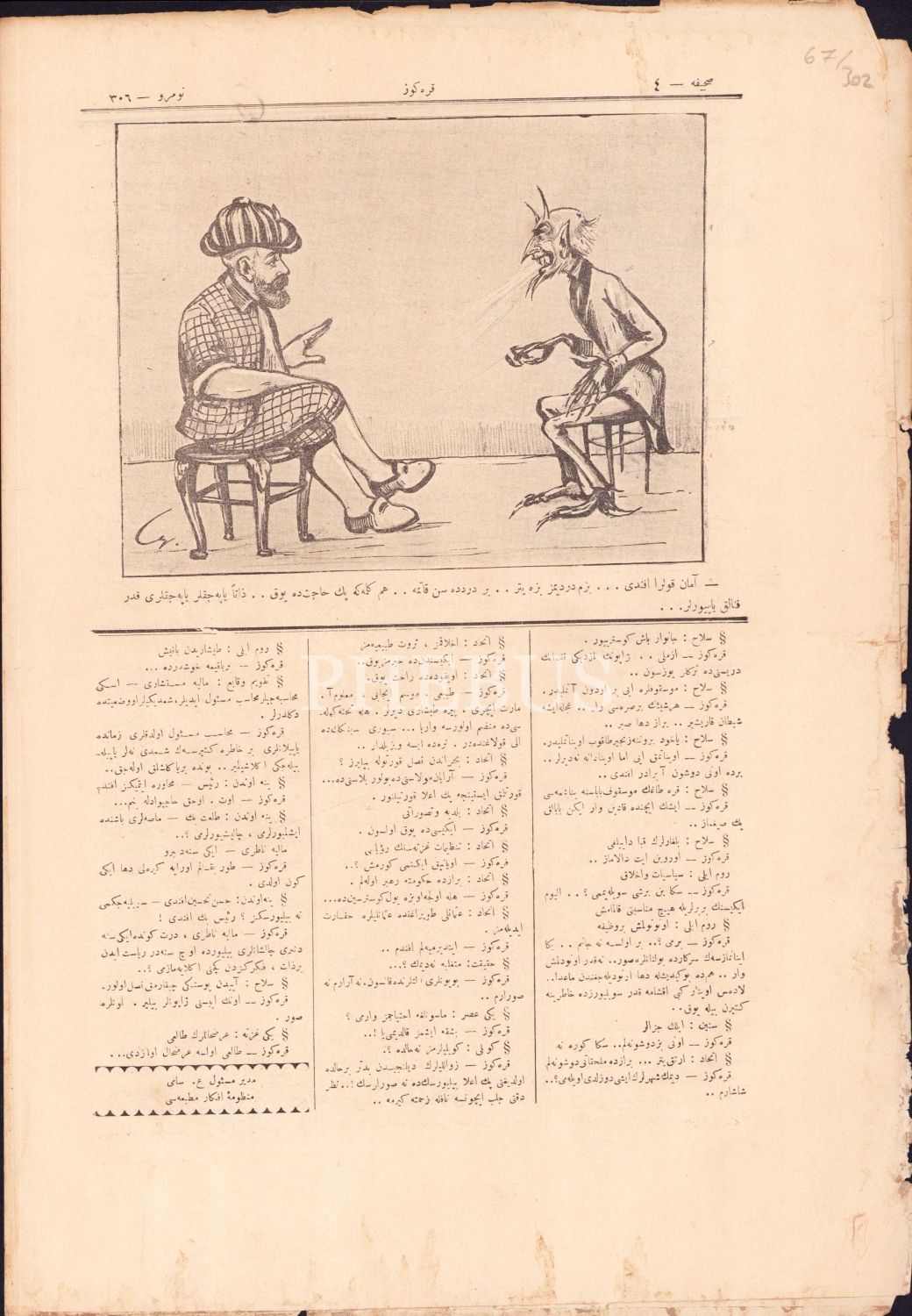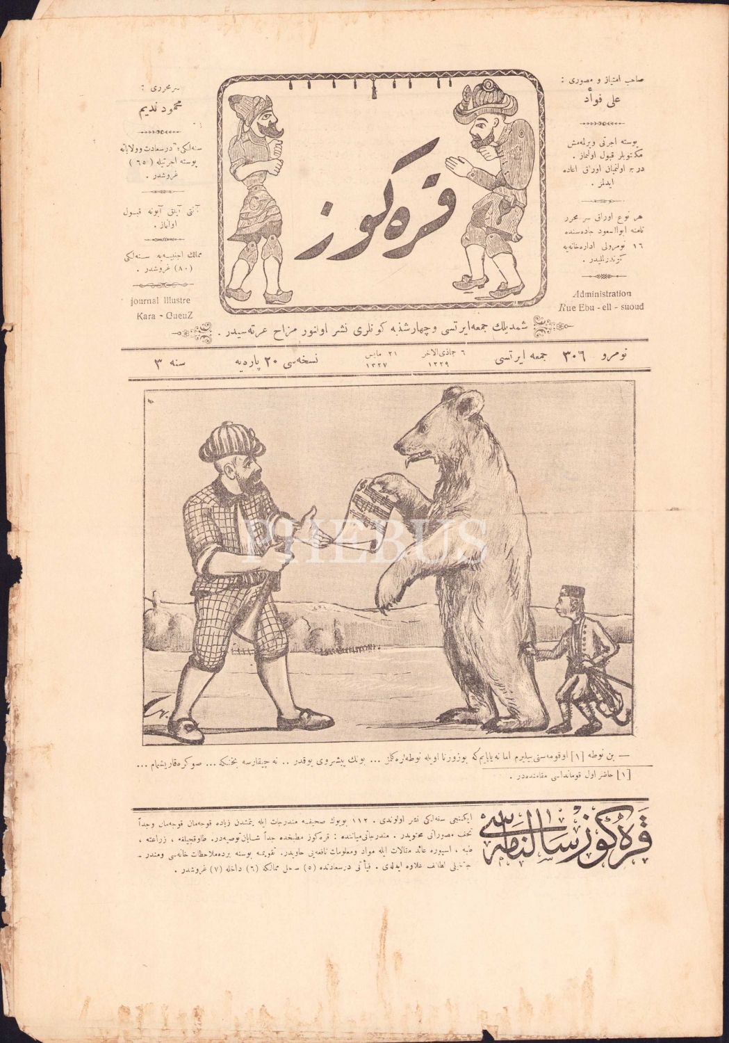 Osmanlıca Karagöz mizah gazetesi, muharriri Mahmud Nedim, 1327 tarihli, 4 sayfa, 28x40 cm