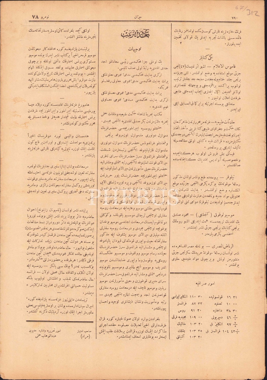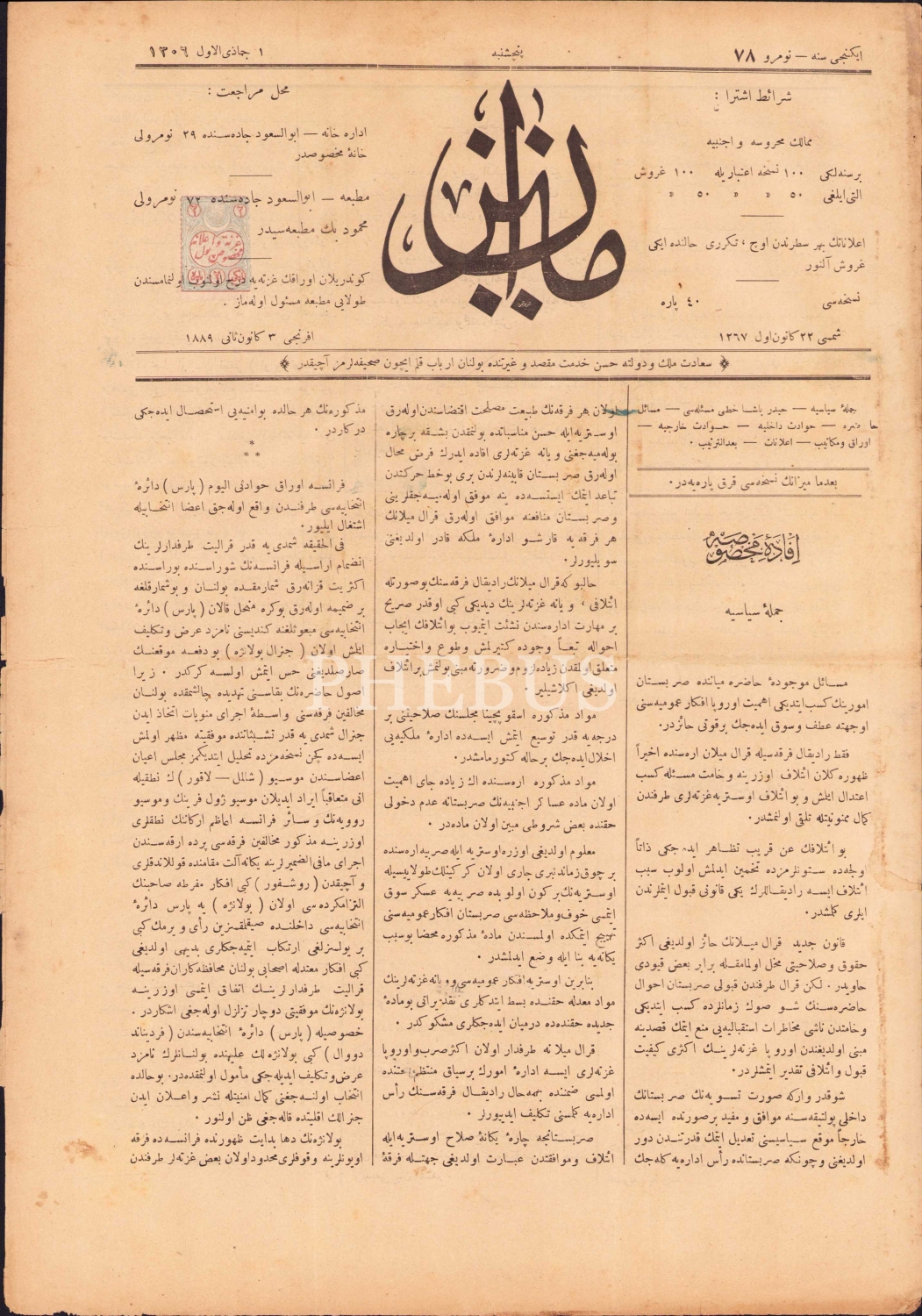 Osmanlıca Mizan gazetesi, 1306 tarihli, postadan geçmiş, sayfa kenarları haliyle, 8 sayfa, 27x40 cm